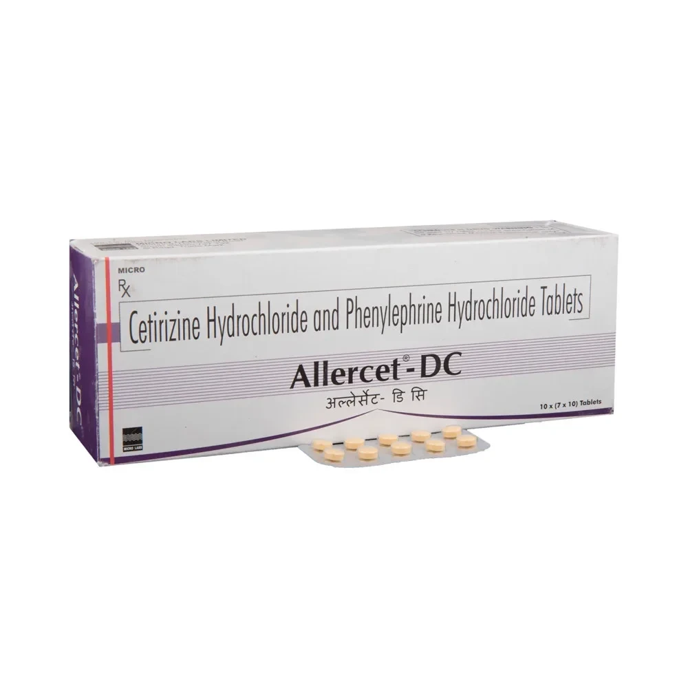 Allercet DC Tab is a combination medication designed to provide comprehensive relief from allergy symptoms. It contains Cetirizine, a second-generation antihistamine, and Pseudoephedrine, a decongestant. Cetirizine works by blocking histamine H1 receptors, thereby reducing allergic reactions such as sneezing, runny nose, and itchy eyes, with minimal sedative effects. Pseudoephedrine acts as a vasoconstrictor, reducing swelling in the nasal passages and sinuses, which effectively relieves nasal congestion and pressure. This dual-action formula targets both the allergic response and the associated congestion, offering effective and long-lasting symptom control for various allergic conditions.