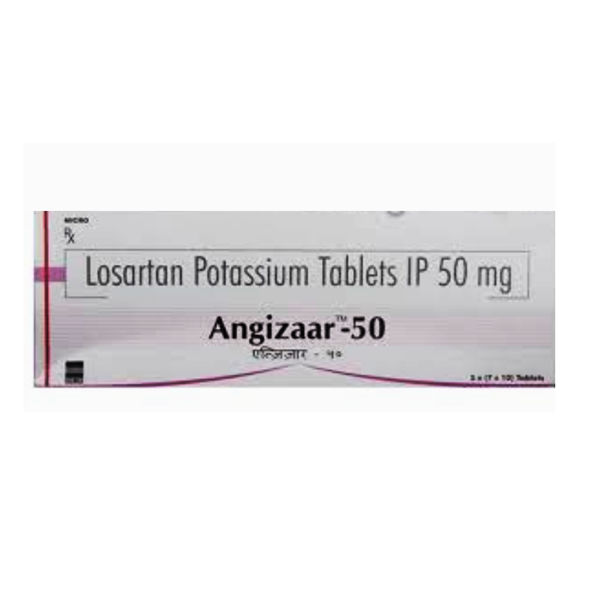 Angizaar 50 mg tablets contain Losartan, an angiotensin II receptor blocker (ARB). This medication works by selectively blocking the binding of angiotensin II to the AT1 receptor, which is responsible for the vasoconstrictive and aldosterone-secreting effects of angiotensin II. By inhibiting these actions, Losartan causes vasodilation, reduces blood pressure, and decreases the workload on the heart. It is widely used in the management of hypertension and heart failure, and also offers renal protection in patients with type 2 diabetes and nephropathy. Its mechanism helps to prevent cardiovascular events and improve overall cardiac function.