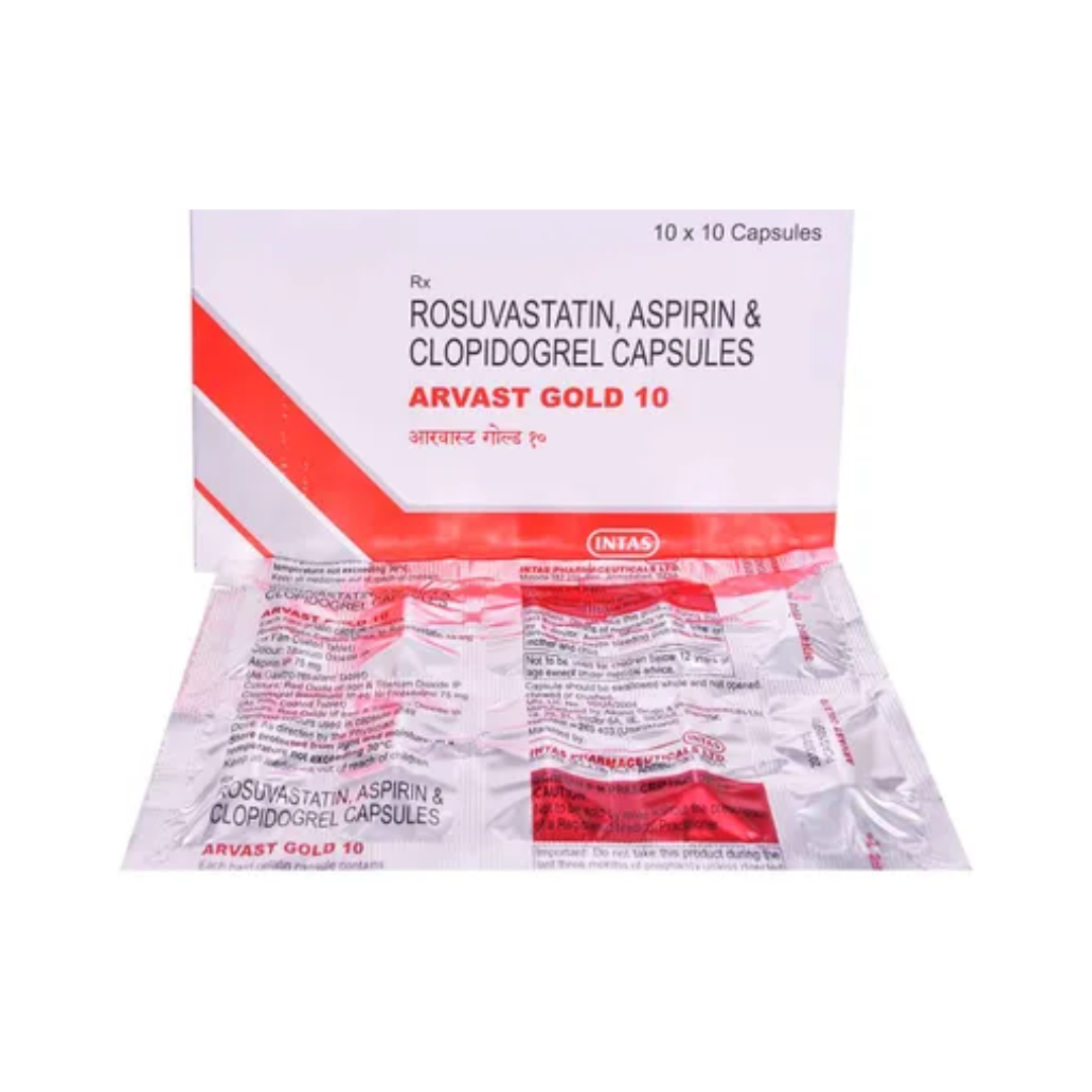 ARVAST GOLD 10 MG TAB is a comprehensive medication designed for the management of complex cardiovascular conditions. It typically combines Atorvastatin, a potent HMG-CoA reductase inhibitor, with antiplatelet agents like Aspirin and Clopidogrel. Atorvastatin works by reducing the production of cholesterol in the liver, thereby lowering LDL-C (bad cholesterol) and triglycerides, while increasing HDL-C (good cholesterol). This action helps to stabilize atherosclerotic plaques and reduce the risk of plaque rupture.