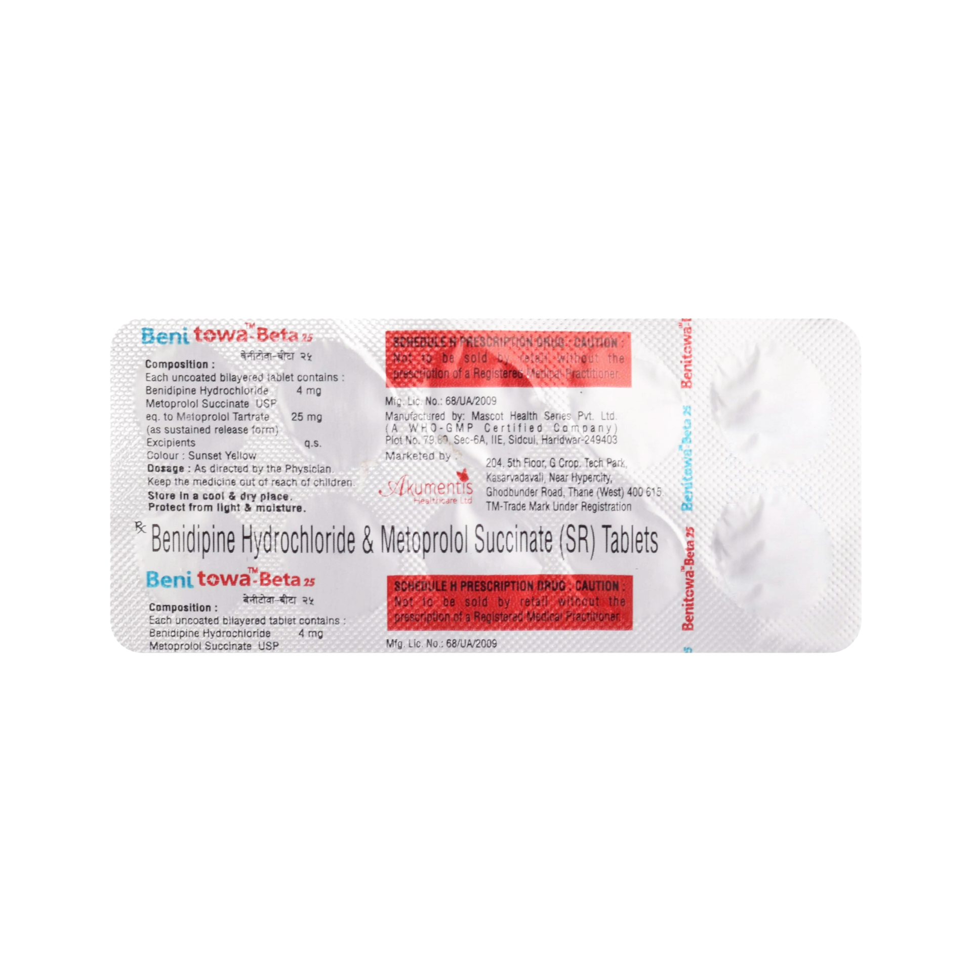 Clinically, BENITOWA BETA 25 is utilized in the management of hypertension (high blood pressure), angina pectoris (chest pain due to reduced blood flow to the heart), certain cardiac arrhythmias (irregular heartbeats), and to prevent recurrent myocardial infarction (heart attack). It can also be used to manage symptoms of anxiety and essential tremor. Its therapeutic benefits stem from its ability to stabilize heart rhythm, reduce cardiac oxygen demand, and control systemic blood pressure, thereby improving cardiovascular outcomes and patient quality of life.