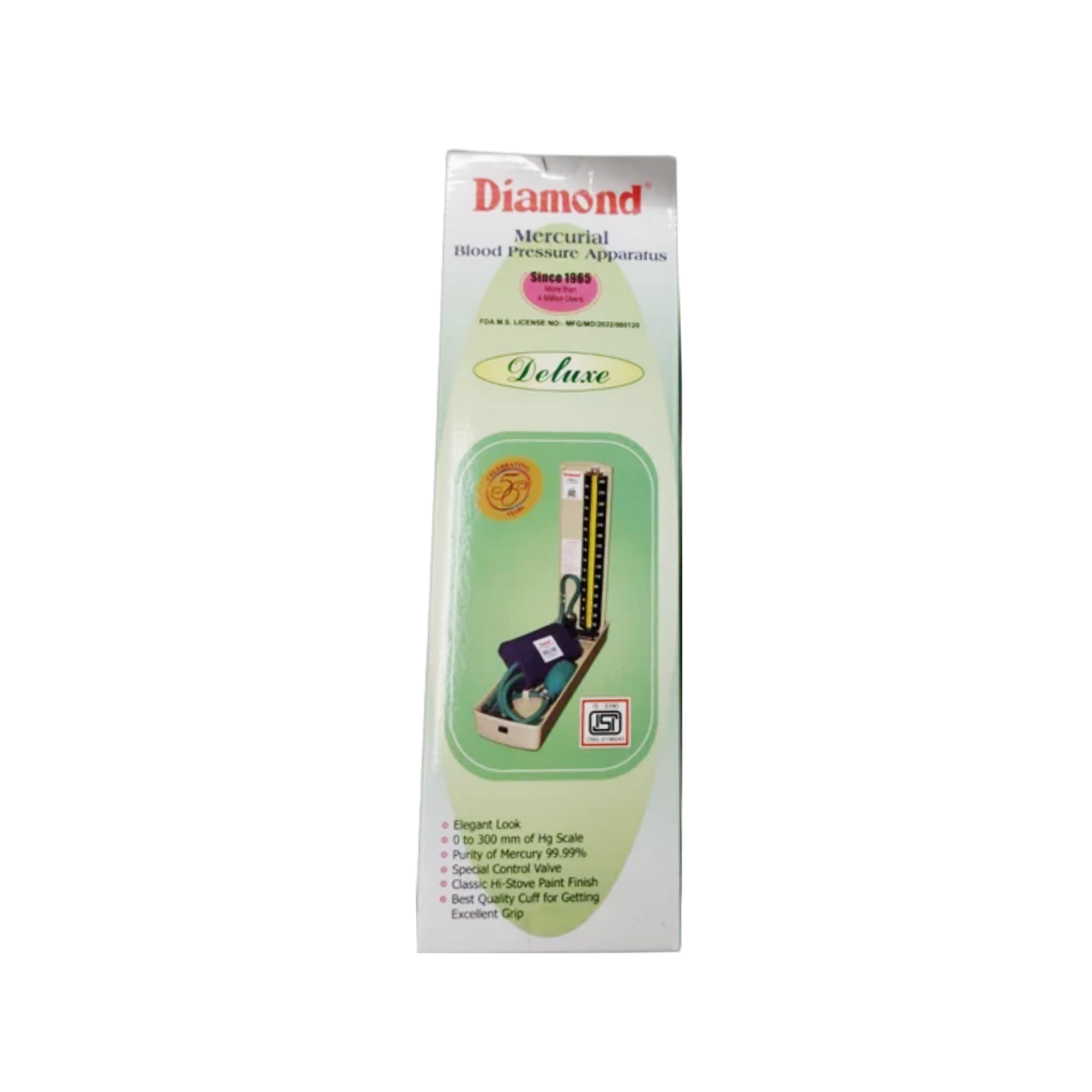The B.P. Diamond Mercurial Deluxe represents a traditional mercurial sphygmomanometer, universally acknowledged as the definitive gold standard for achieving the most accurate blood pressure measurements in clinical environments. This sophisticated device harnesses a precisely calibrated column of mercury to indicate blood pressure with unparalleled accuracy and unwavering reliability. Its construction includes an inflatable cuff, a rubber bulb for inflation, a controlled release valve, and a prominent vertical glass tube containing the mercury, which dynamically rises and falls in direct response to pressure changes. Requiring a stethoscope for the critical auscultation of Korotkoff sounds, the mercurial monitor is highly favored by experienced healthcare professionals for its consistently superior performance and the direct, unambiguous visual representation of pressure, firmly establishing it as the benchmark for the calibration and validation of all other types of blood pressure measuring devices.
