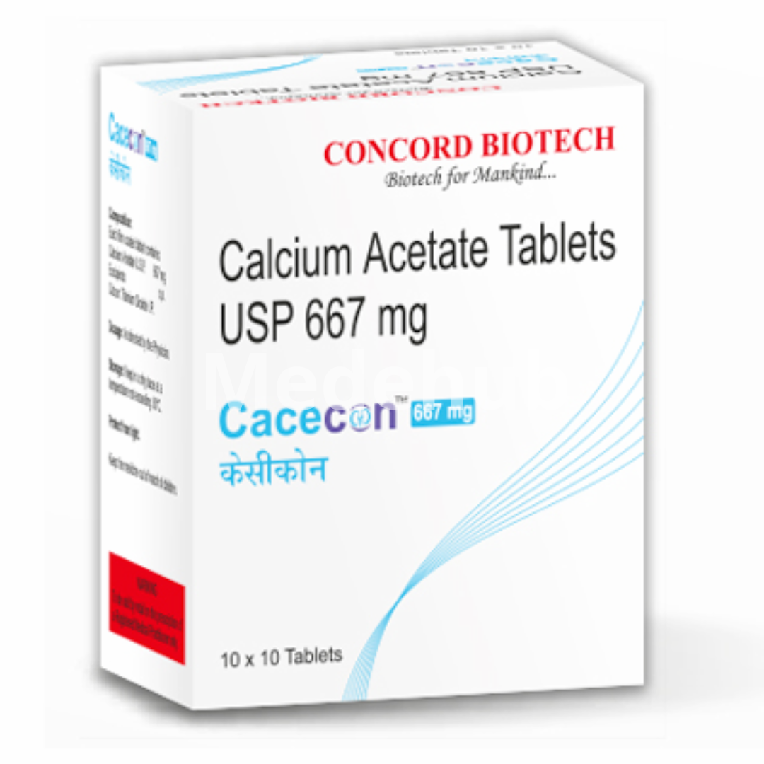 Cacecon 667 mg Tablet contains Calcium acetate, a medication commonly prescribed to control high phosphate levels in the blood (hyperphosphatemia). It is mainly used in patients with chronic kidney disease (CKD) and end-stage renal disease (ESRD) who are undergoing dialysis. By lowering phosphate levels, it helps protect bone health, reducing the risk of fractures and bone-related complications. It may also decrease the risk of cardiovascular problems, such as heart disease and blood vessel calcification. When combined with dietary changes, Cacecon 667 mg Tablet improves phosphate control and may relieve symptoms like itching and skin irritation, which are common in kidney disease.