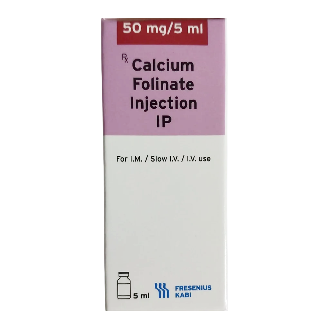 Calcium Folinate 50mg Injection, also known as Leucovorin, is a form of folic acid that does not require reduction by dihydrofolate reductase to be active. It is primarily used in oncology as a 'rescue' agent to counteract the toxic effects of folic acid antagonists, particularly methotrexate, which is a potent chemotherapy drug. By providing a readily available source of reduced folates, Calcium Folinate protects healthy cells from methotrexate's cytotoxic effects, especially in the bone marrow and gastrointestinal tract, thereby preventing severe myelosuppression and mucositis. Additionally, it is used to enhance the cytotoxic effects of fluorouracil in the treatment of various cancers and can be used to treat megaloblastic anemia due to folate deficiency.