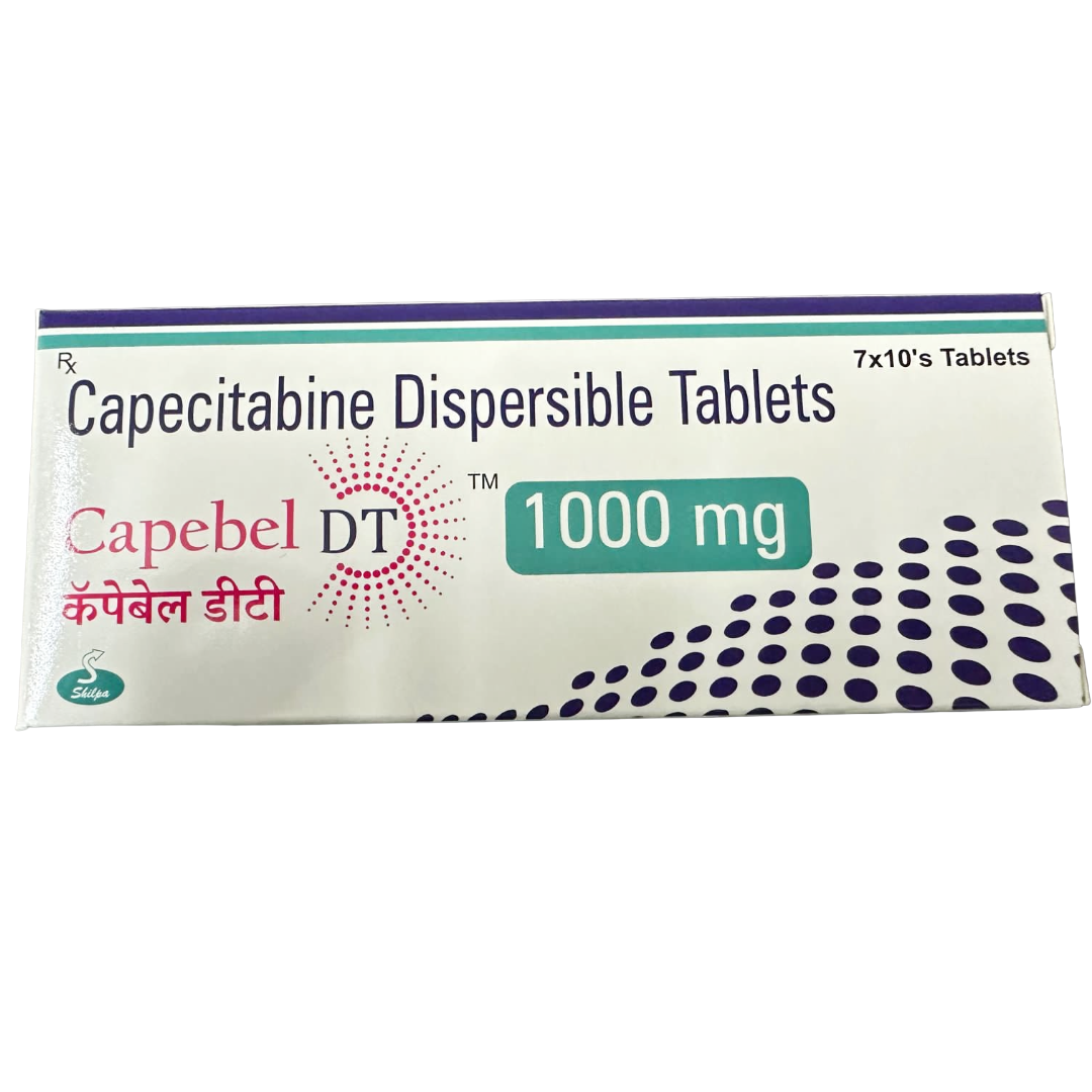 Capebel DT 1000mg Tablet contains Capecitabine, an oral fluoropyrimidine carbamate that acts as a prodrug of 5-fluorouracil (5-FU). It is selectively activated in tumor cells through a three-step enzymatic process, leading to the formation of 5-FU, which then interferes with DNA and RNA synthesis. This targeted mechanism results in the inhibition of cancer cell growth and induction of apoptosis, making it an effective agent in various oncology regimens. Its oral administration offers significant convenience for patients undergoing long-term treatment.