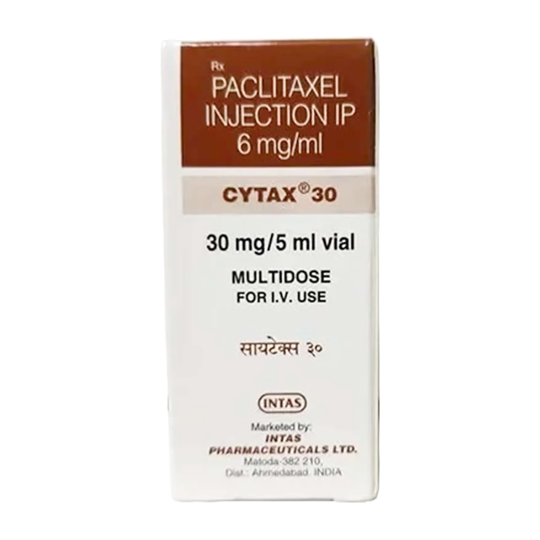 Cytax 30mg Injection, containing Paclitaxel, is a highly effective antineoplastic agent belonging to the taxane class of chemotherapy drugs. It works by stabilizing microtubules, which are critical components of the cell's cytoskeleton and essential for cell division. By preventing the depolymerization of microtubules, paclitaxel disrupts the normal process of mitosis, leading to cell cycle arrest and ultimately inducing apoptosis (programmed cell death) in cancer cells.