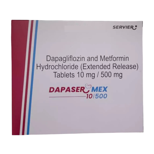 DAPASER MEX 10/500, a combination of dapagliflozin 10mg and metformin 500mg, is a medication used to improve glycemic control in adults with type 2 diabetes mellitus. Dapagliflozin is a sodium-glucose co-transporter 2 (SGLT2) inhibitor that reduces glucose reabsorption in the kidneys, leading to increased glucose excretion in the urine. Metformin, a biguanide, primarily works by reducing hepatic glucose production, decreasing intestinal glucose absorption, and improving insulin sensitivity in peripheral tissues. The combination of these two agents provides complementary mechanisms of action to effectively lower blood glucose levels. This dual therapy offers comprehensive glycemic control, with additional benefits such as potential weight reduction and the established cardiovascular and renal protective effects associated with dapagliflozin. This specific formulation contains 10mg of dapagliflozin and 500mg of metformin.