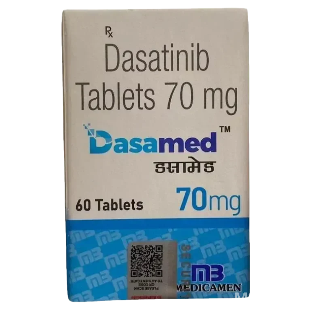 Dasamed 70mg Tablet belongs to a class of medications known as tyrosine kinase inhibitors (TKIs). It functions by selectively inhibiting the activity of specific enzymes, particularly BCR-ABL tyrosine kinase, which are crucial for the proliferation and survival of cancer cells in certain types of leukemia. By blocking these abnormal proteins, the medication helps to control the growth of cancerous cells and reduce their numbers in the body. This targeted action minimizes damage to healthy cells compared to traditional chemotherapy, leading to a more specific therapeutic effect.