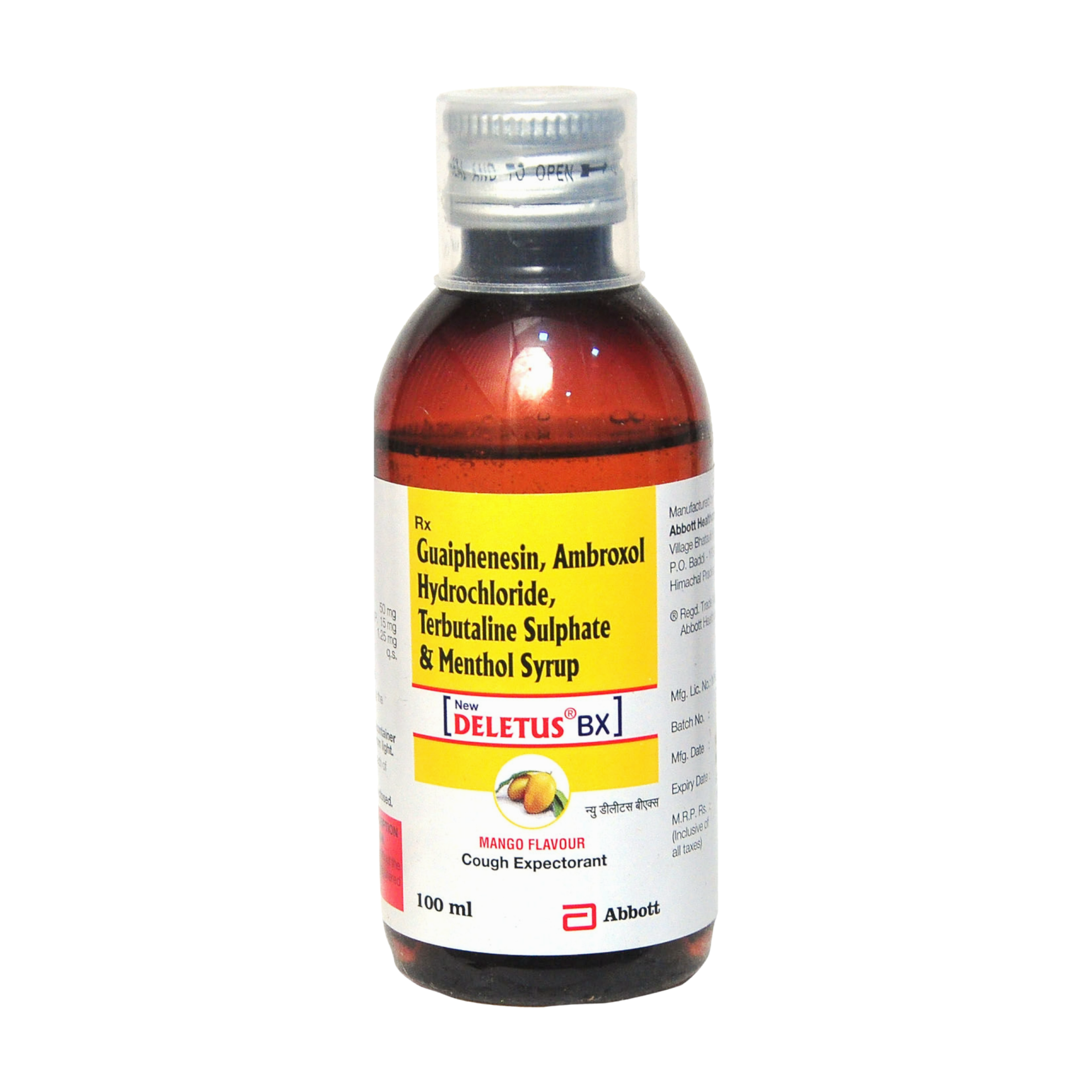 DELETUS BX LIQ 100ML is a cough syrup formulated to provide relief from productive cough associated with various respiratory conditions. It typically combines a mucolytic agent, an expectorant, and a bronchodilator. The mucolytic component, such as bromhexine, works by breaking down the complex mucopolysaccharide fibers in sputum, thereby reducing its viscosity and making it easier to liquefy. The expectorant, often guaifenesin, then stimulates the respiratory tract to produce more fluid, further thinning the mucus and facilitating its expulsion from the airways. Concurrently, the bronchodilator helps to relax the smooth muscles surrounding the bronchi, widening the air passages and improving airflow, which can alleviate symptoms like wheezing and shortness of breath.
