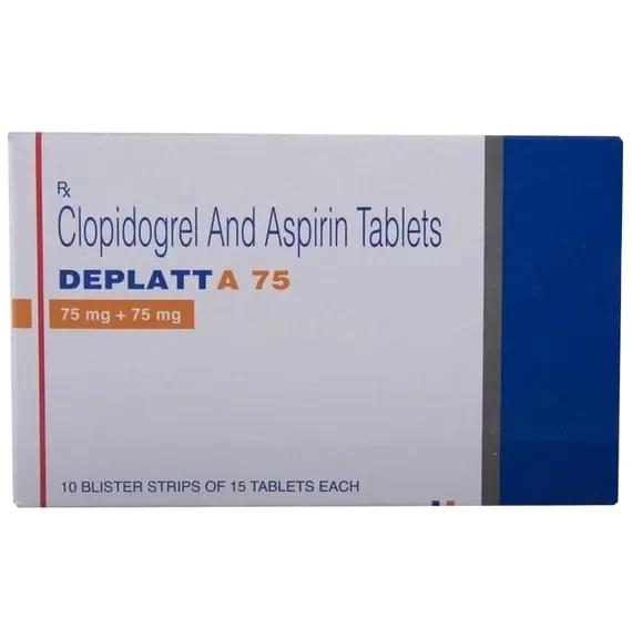 Deplatt A 75 Tablet is a combination medication containing Clopidogrel and Aspirin (acetylsalicylic acid) in a low dose. Both are antiplatelet agents that work by preventing platelets from sticking together and forming harmful blood clots. Clopidogrel selectively inhibits the binding of adenosine diphosphate (ADP) to its platelet receptor, thereby inhibiting ADP-mediated activation of the glycoprotein GPIIb/IIIa complex and subsequent platelet aggregation. Aspirin, on the other hand, irreversibly inhibits cyclooxygenase-1 (COX-1) in platelets, leading to reduced production of thromboxane A2, a potent inducer of platelet aggregation and vasoconstriction. This dual antiplatelet therapy (DAPT) is crucial in reducing the risk of thrombotic events.