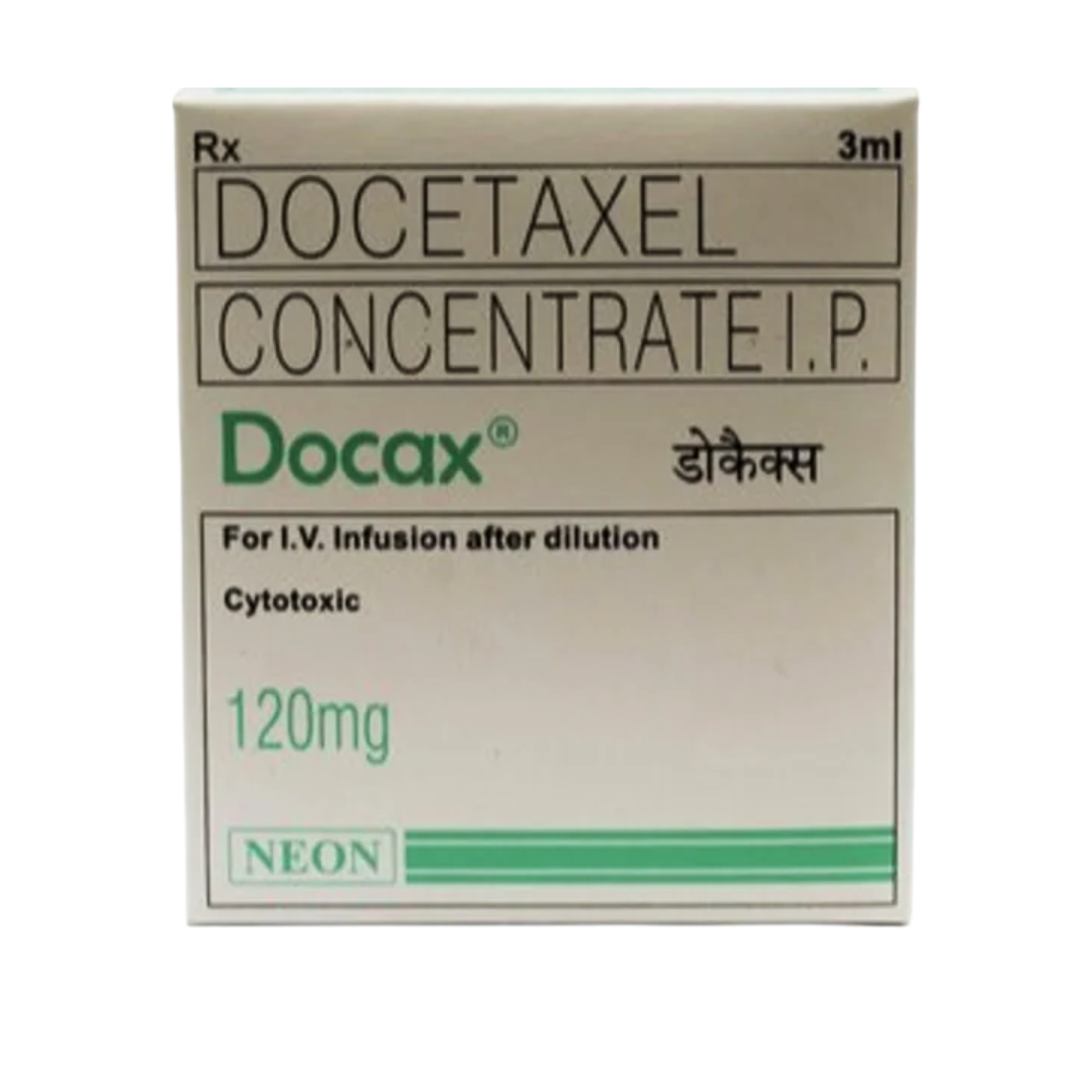 Docax 120mg Injection is an antineoplastic agent belonging to the taxane class, primarily utilized in the systemic treatment of various solid tumors. Its mechanism of action involves promoting the assembly of microtubules and inhibiting their depolymerization, leading to the stabilization of microtubules. This disruption of the dynamic equilibrium of the microtubule network is essential for vital cellular functions, including mitosis and interphase processes. Consequently, Docax arrests cells in the G2/M phase of the cell cycle, ultimately inducing apoptosis in rapidly proliferating cancer cells. Administered intravenously, its therapeutic efficacy is dependent on precise dosing and careful management of potential adverse effects, often requiring premedication to mitigate hypersensitivity reactions.
