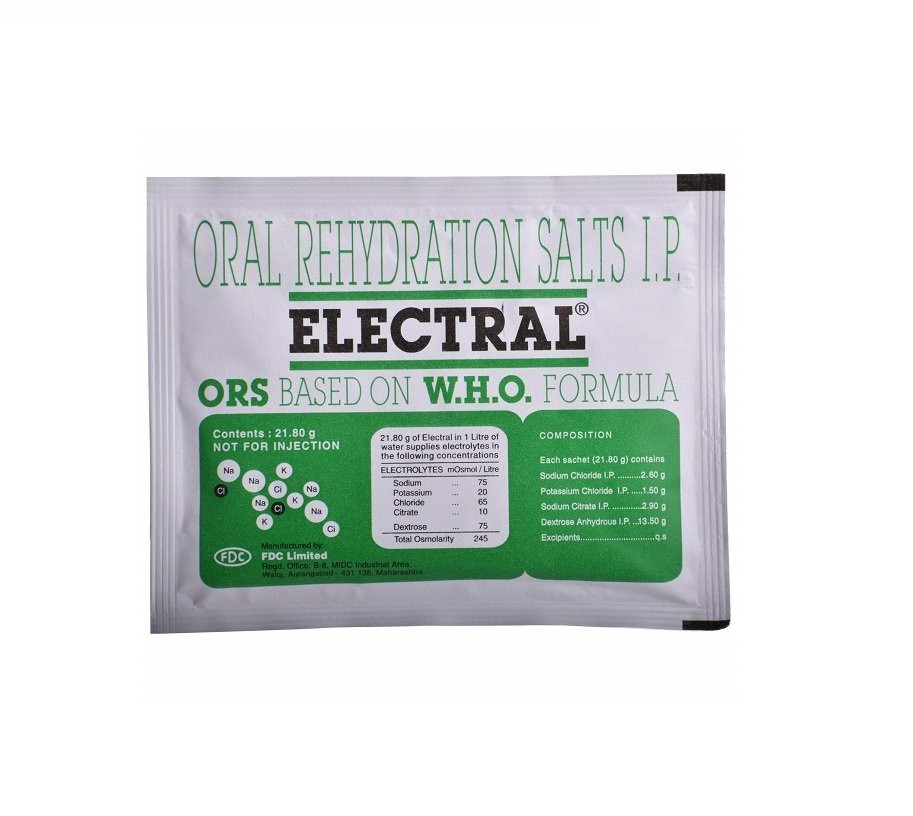 ELECTRAL 21.80POW 20GM is an oral rehydration salt (ORS) formulation designed to replenish fluids and electrolytes lost due to dehydration. It contains a balanced blend of glucose, sodium chloride, potassium chloride, and sodium citrate, which are essential for maintaining the body's fluid balance and proper cellular function. This formulation is crucial in managing and preventing dehydration caused by conditions such as acute diarrhea, vomiting, excessive sweating, or other illnesses that lead to significant fluid loss. The glucose component facilitates the absorption of sodium and water in the small intestine, ensuring rapid rehydration.