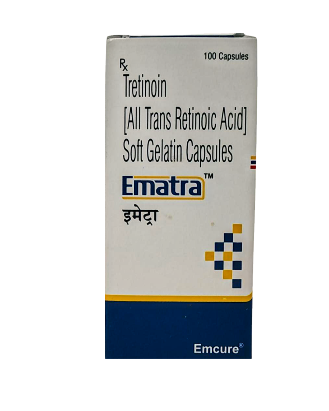 Ematra capsule is an antineoplastic medication containing the active ingredient Tretinoin, which belongs to the retinoid class, similar to vitamin A. It is used to treat acute promyelocytic leukemia, a type of blood disorder, by slowing the growth of abnormal blood cells.
