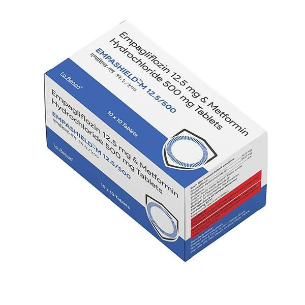 EMPASHILD M 12.5/500 is a fixed-dose combination medication containing Empagliflozin 12.5mg and Metformin 500mg, indicated for the management of type 2 diabetes mellitus. Empagliflozin, an SGLT2 inhibitor, lowers blood glucose by inhibiting glucose reabsorption in the kidneys, leading to increased urinary glucose excretion. Metformin, a biguanide, reduces hepatic glucose production, decreases intestinal glucose absorption, and improves insulin sensitivity in peripheral tissues. This combination provides a comprehensive approach to glycemic control by addressing multiple pathophysiological defects of type 2 diabetes. It not only helps to significantly reduce HbA1c but also offers additional benefits such as weight management and cardiovascular protection, making it a robust option for patients requiring multifaceted glycemic control.