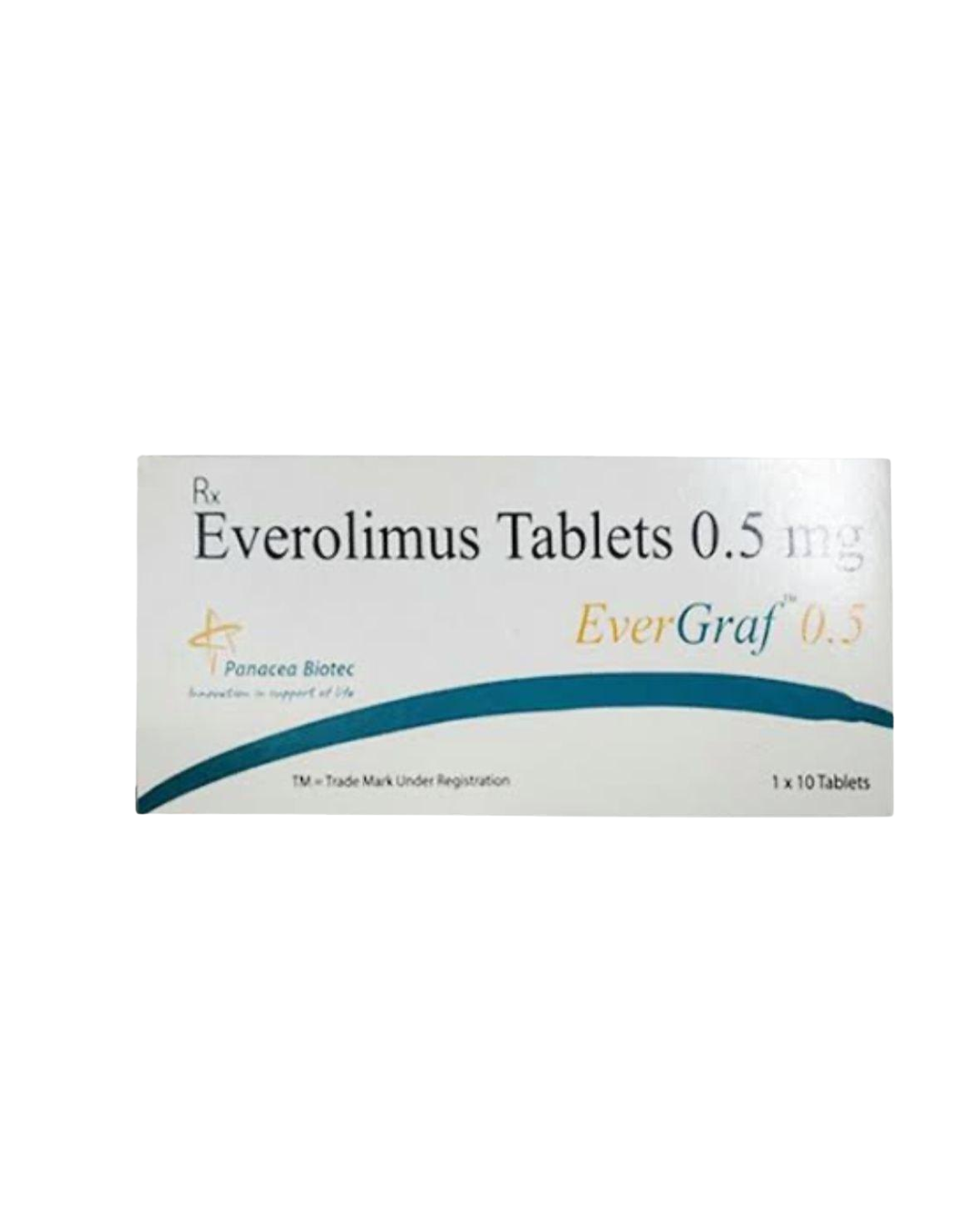 Evergraf 0.5mg Tablet is an antineoplastic medication from the class of mTOR kinase inhibitors, containing the active ingredient everolimus. It is prescribed for the treatment of advanced breast cancer, renal cell carcinoma, pancreatic neuroendocrine tumors, and subependymal giant cell astrocytoma (tumors located in the brain ventricles). Since this medicine may cause mouth sores or ulcers, maintaining good oral hygiene and scheduling regular dental check-ups are recommended. In the treatment of subependymal giant cell astrocytoma, it is sometimes used in combination with cyclophosphamide, an alkylating agent.