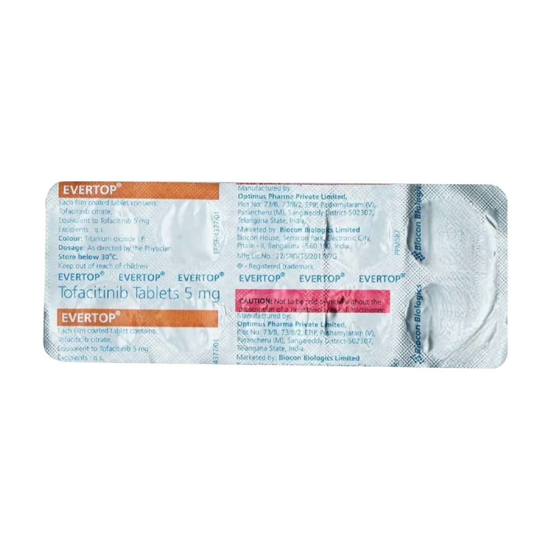Evertop 5mg Tablet contains Everolimus, an mTOR (mammalian target of rapamycin) inhibitor with immunosuppressive and antiproliferative properties. It is used in a variety of indications, including advanced renal cell carcinoma, advanced pancreatic neuroendocrine tumors, subependymal giant cell astrocytoma (SEGA) associated with tuberous sclerosis, and hormone receptor-positive, HER2-negative advanced breast cancer. Everolimus works by forming a complex with FKBP-12, which then inhibits mTOR, a central regulator of cell growth, proliferation, and survival.