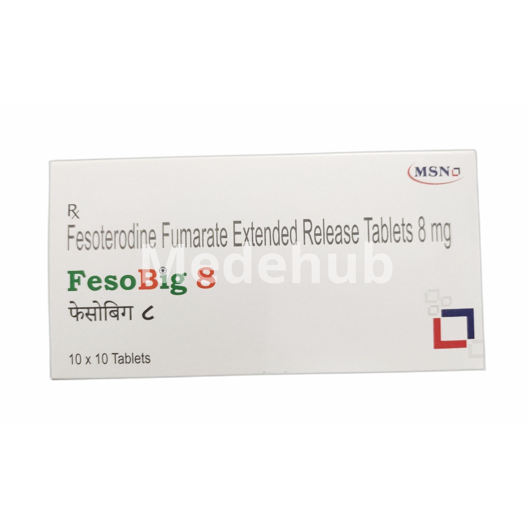 Fesobig 8 Tablet contains Fesoterodine, an antimuscarinic medication used to treat the symptoms of overactive bladder (OAB). OAB is characterized by a sudden, uncontrollable urge to urinate (urgency), frequent urination (frequency), and involuntary leakage of urine (urge incontinence). Fesoterodine works by relaxing the smooth muscles of the bladder wall. It is a prodrug that is rapidly converted to its active metabolite, 5-hydroxymethyl tolterodine, which then blocks muscarinic receptors in the bladder. This action helps to increase the bladder's capacity, reduce the frequency of involuntary bladder contractions, and alleviate the sensation of urgency, thereby improving bladder control.