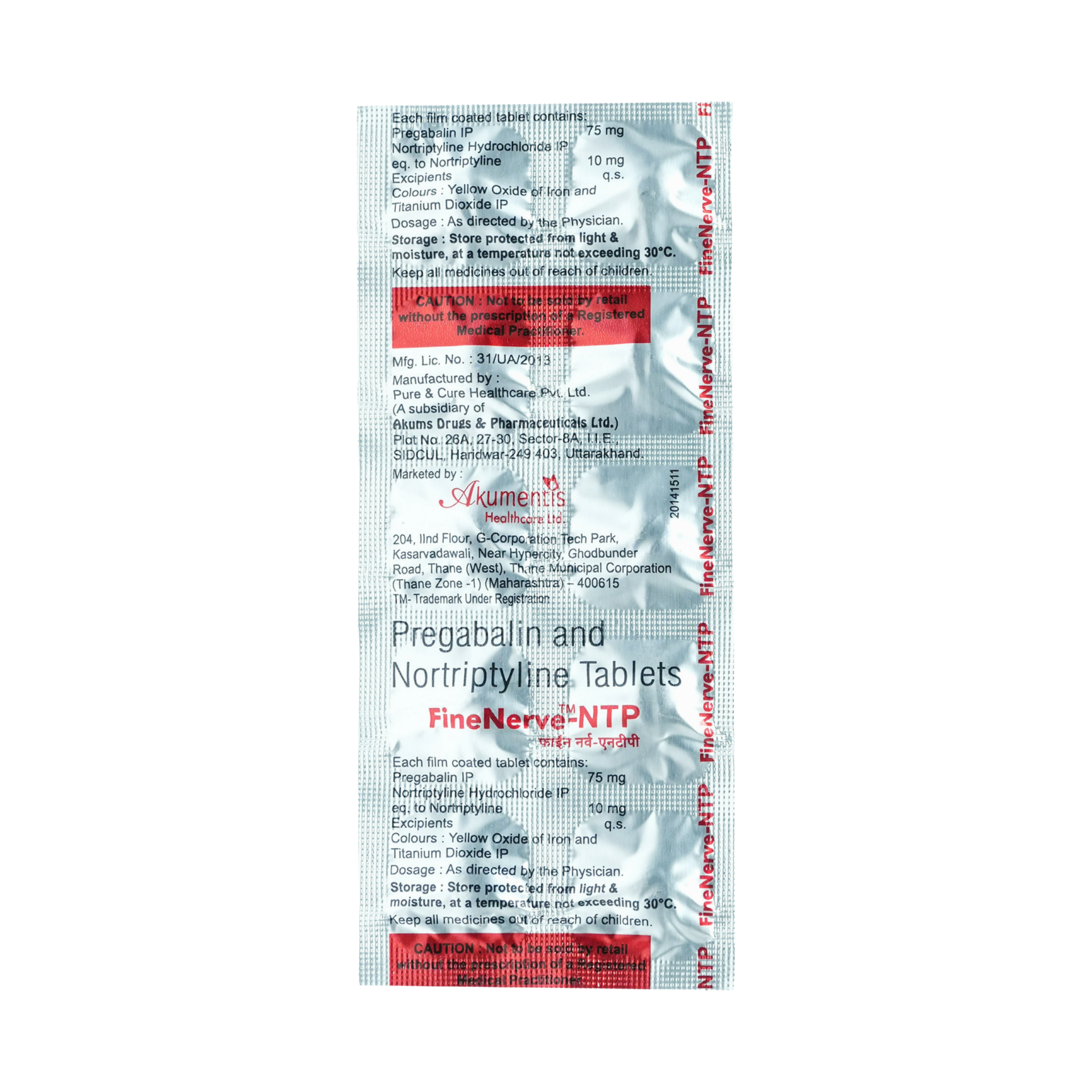 Fine Nerve NTP is a combination medication typically comprising Gabapentin, an anticonvulsant, Nortriptyline, a tricyclic antidepressant, and Methylcobalamin, a form of Vitamin B12. This formulation is primarily used for the comprehensive management of neuropathic pain, a condition stemming from nerve damage. Gabapentin works by stabilizing nerve activity and reducing abnormal pain signals, while Nortriptyline enhances the levels of pain-modulating neurotransmitters like serotonin and norepinephrine, also contributing to mood improvement. Methylcobalamin supports nerve health and regeneration, which is crucial in addressing the underlying nerve damage. Together, these components provide synergistic relief from symptoms such as burning, tingling, and shooting pain, improve nerve function, and alleviate associated discomfort and sleep disturbances.