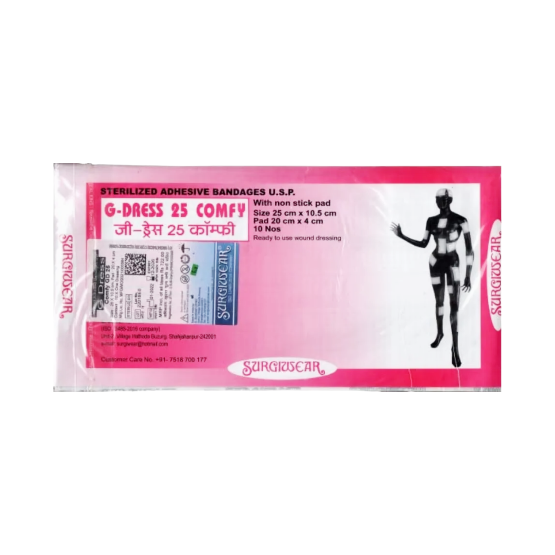 The G DRESS COMFY-25 is a sterile, advanced self-adhesive wound dressing meticulously crafted for the effective management of a variety of wound types, providing an optimal balance of robust protection and efficient absorbency. This dressing typically features a soft, highly absorbent, and non-adherent pad, strategically positioned at its core, integrated onto a flexible, breathable backing material that incorporates a gentle, skin-friendly adhesive border. The fundamental design objective is to establish an ideal moist wound healing environment, which is crucial for cellular proliferation and tissue repair, while simultaneously safeguarding the wound from external contaminants and effectively absorbing exudate. The "Comfy" range is distinguished by its unwavering focus on patient comfort, achieved through the utilization of materials that conform effortlessly to body contours and adhesives engineered to minimize skin irritation, making it an excellent choice for sensitive skin and applications requiring prolonged wear.