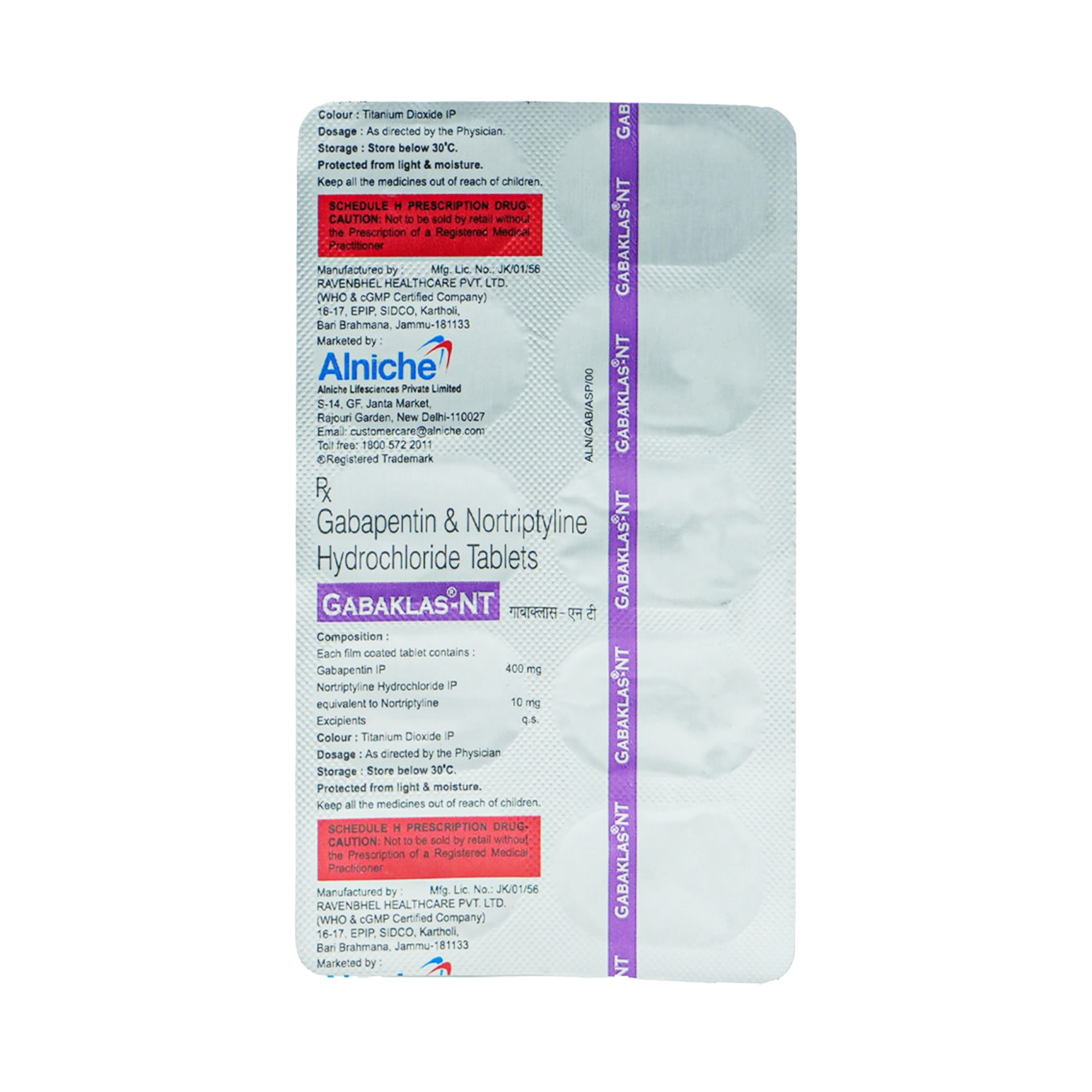 GABAKLAS NT is a combination medication typically containing Gabapentin and Nortriptyline, designed to manage neuropathic pain. Gabapentin is an anticonvulsant that works by modulating the activity of voltage-gated calcium channels, thereby reducing the release of excitatory neurotransmitters and stabilizing neuronal membranes. This action helps to alleviate nerve pain. Nortriptyline is a tricyclic antidepressant (TCA) that enhances the effects of norepinephrine and serotonin in the brain, which are neurotransmitters involved in pain modulation. It also has analgesic properties independent of its antidepressant effects. The synergistic action of Gabapentin and Nortriptyline provides comprehensive relief for various forms of neuropathic pain, such as diabetic neuropathy, postherpetic neuralgia, and fibromyalgia, by targeting different pain pathways and improving sleep quality often disrupted by chronic pain.