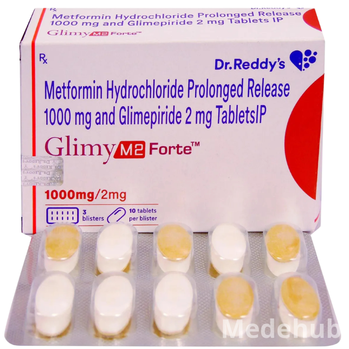 This medication is a combination therapy for Type 2 Diabetes Mellitus, featuring glimepiride, a sulfonylurea, and metformin, a biguanide. Glimepiride primarily functions by stimulating the beta cells in the pancreas to release more insulin, thereby lowering blood glucose levels. Metformin, on the other hand, works through multiple mechanisms: it significantly reduces glucose production in the liver, decreases the absorption of glucose from the intestines, and importantly, enhances the body's sensitivity to insulin, allowing cells to utilize glucose more effectively. This dual action provides a comprehensive and complementary approach to managing hyperglycemia, aiming to improve overall glycemic control in adult patients whose blood sugar levels are not adequately managed by diet and exercise alone, or by monotherapy with either agent. The synergistic effect of these two agents helps to achieve better therapeutic outcomes and reduce the risk of long-term diabetic complications.