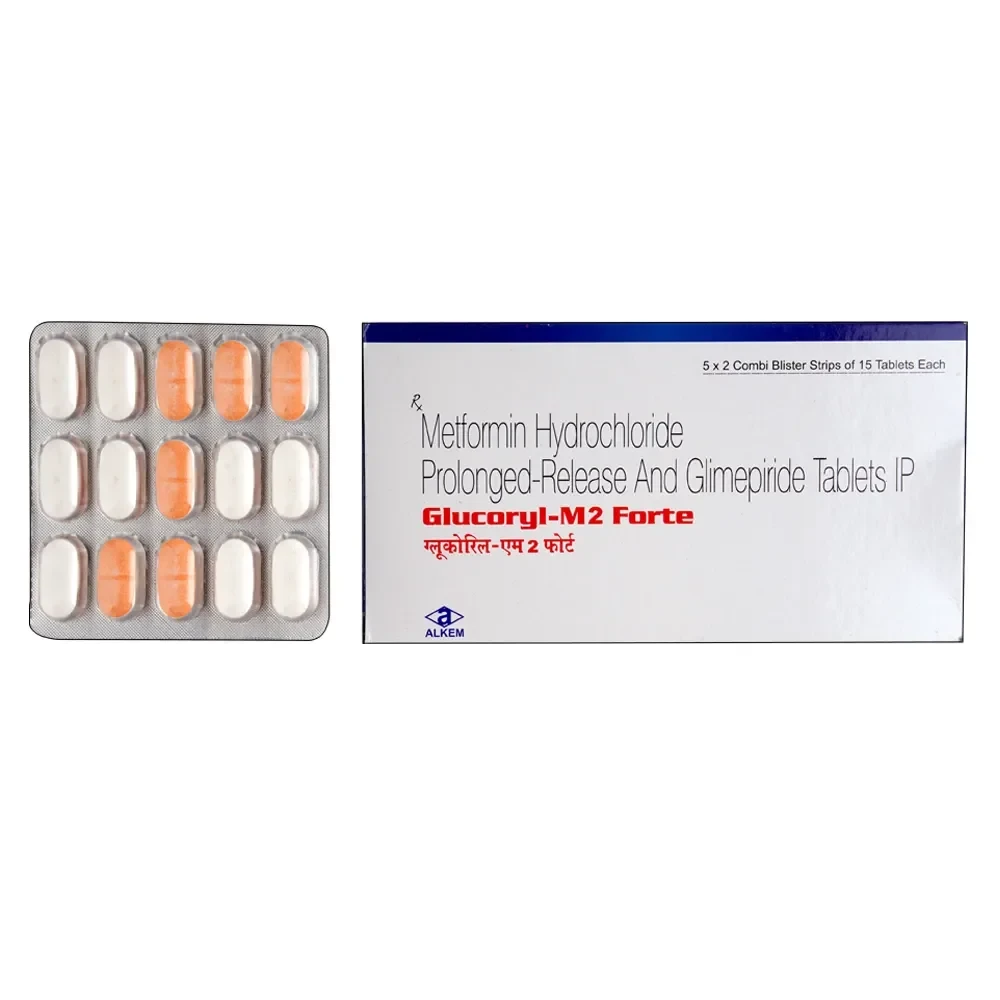 Glucoryl M2 Forte is a combination oral antidiabetic medication prescribed for adults with type 2 diabetes mellitus. It combines glimepiride, a sulfonylurea that stimulates insulin secretion from pancreatic beta cells, and metformin hydrochloride, a biguanide that reduces hepatic glucose production and improves peripheral insulin sensitivity. This synergistic action helps to achieve better glycemic control than either drug used alone. The "Forte" variant indicates a higher dosage strength, suitable for patients who require more intensive management of their blood sugar levels when diet, exercise, and lower-dose monotherapy or combination therapy have proven insufficient. By targeting different pathways involved in glucose regulation, Glucoryl M2 Forte helps to achieve and maintain optimal glycemic control, thereby reducing the risk of long-term diabetes complications.