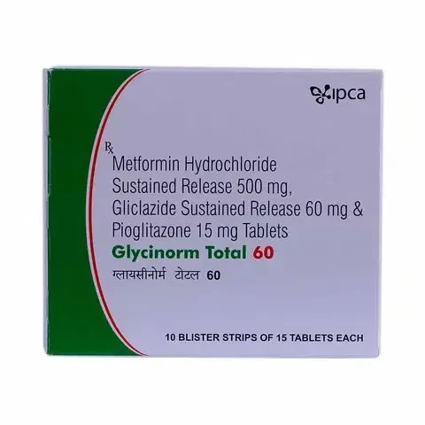 Glycinorm Total 60 is a combination oral anti-diabetic medication containing Gliclazide (a sulfonylurea) and Metformin (a biguanide), used to improve glycemic control in adults with type 2 diabetes mellitus. Gliclazide works by stimulating insulin secretion from the pancreatic beta cells, particularly in the presence of glucose. Metformin, on the other hand, primarily reduces hepatic glucose production, decreases intestinal absorption of glucose, and improves insulin sensitivity by increasing peripheral glucose uptake and utilization.