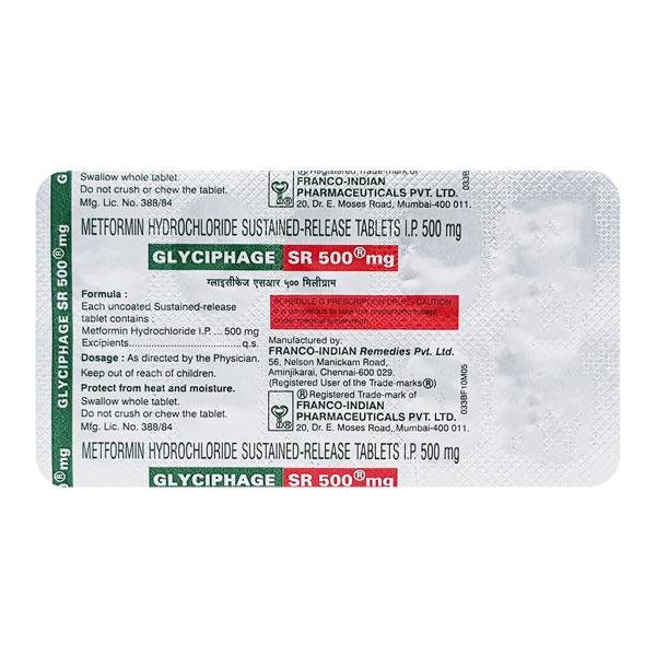 GLYCIPHAGE SR 500MG TAB contains Metformin in a sustained-release (SR) formulation, an essential oral biguanide antihyperglycemic agent widely prescribed for the effective management of type 2 diabetes mellitus. The sustained-release characteristic of this formulation is designed to provide a slower, more gradual, and prolonged release of the active ingredient throughout the day. This controlled release mechanism often translates into significantly improved gastrointestinal tolerability, reducing common side effects such as nausea and diarrhea, and offers the added convenience of a once-daily dosing regimen, a notable advantage over immediate-release metformin. Metformin primarily exerts its therapeutic effects by decreasing glucose production in the liver, reducing the absorption of glucose from the intestines, and crucially, enhancing the body's sensitivity to insulin. This comprehensive action helps to lower blood sugar levels effectively without directly stimulating insulin secretion, thereby minimizing the inherent risk of hypoglycemia.