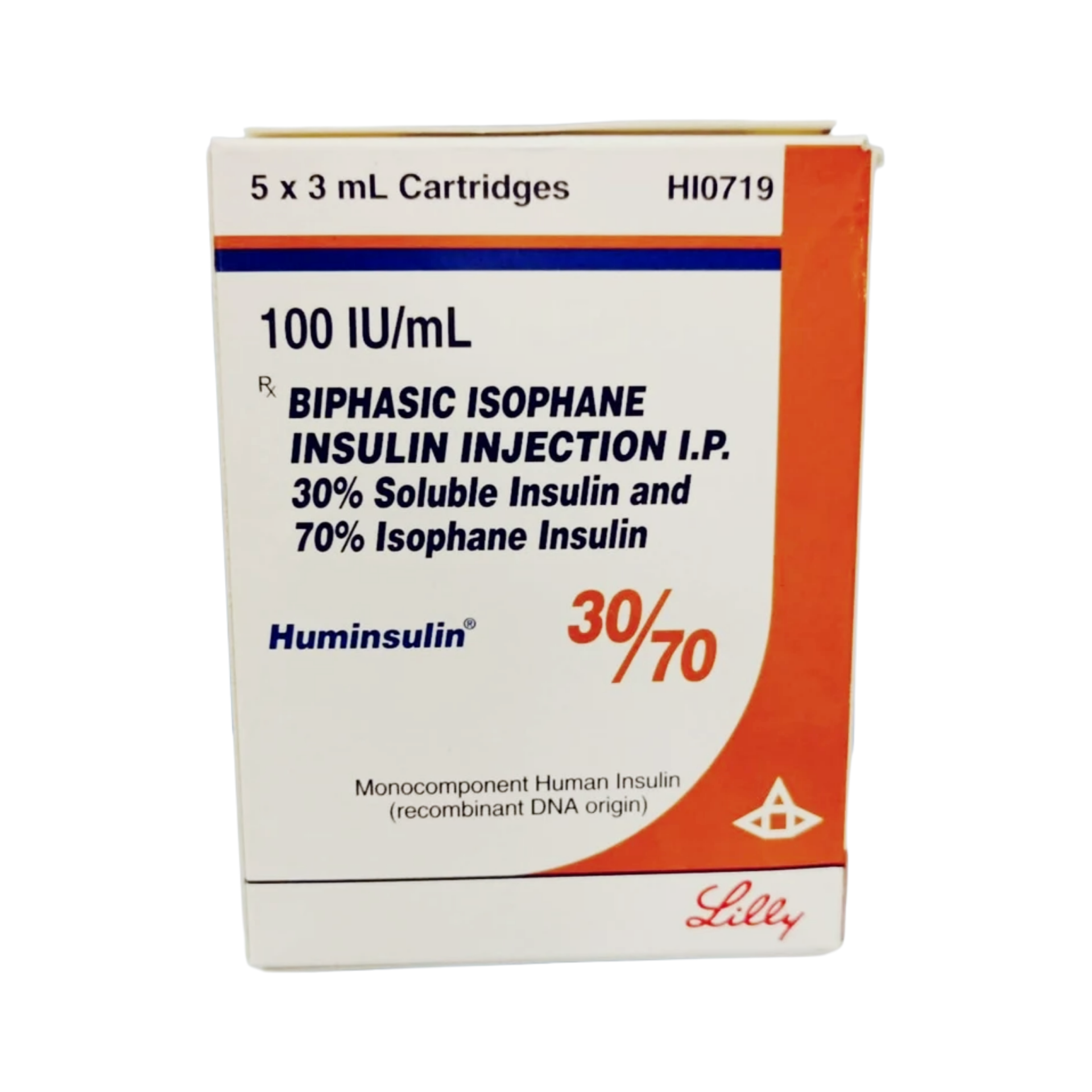 Haminsulin 30/70 Cartridge 1Vial contains biphasic human insulin 30/70, a premixed insulin formulation. This product consists of 30% soluble human insulin and 70% isophane human insulin (NPH). It is indicated for the treatment of diabetes mellitus in patients who require both mealtime and basal insulin for glycemic control. The soluble human insulin component provides a relatively rapid onset of action to cover mealtime glucose needs, while the isophane human insulin component offers a prolonged duration of action, addressing basal insulin requirements throughout the day. This combination allows for a simplified insulin regimen, often requiring fewer daily injections compared to separate rapid and intermediate-acting insulin regimens, which can enhance patient convenience and adherence. The vial format allows for flexible dosing and is typically administered via a syringe. Regular monitoring of blood glucose levels is crucial to optimize dosing and achieve target glycemic goals, minimizing the risk of both hyperglycemia and hypoglycemia.