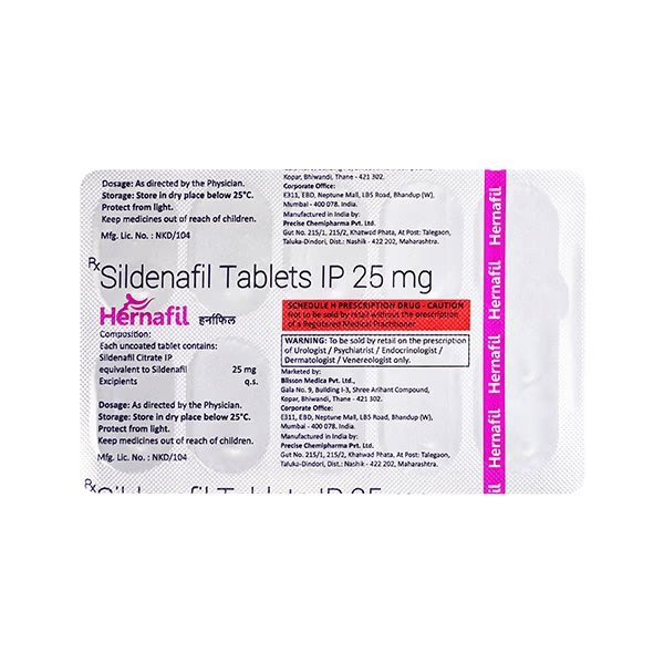 HERNAFIL TAB is a prescription medication primarily indicated for the treatment of erectile dysfunction (ED) in adult men. It belongs to the class of drugs known as phosphodiesterase-5 (PDE5) inhibitors. The mechanism of action involves enhancing the effects of nitric oxide, a natural chemical the body produces during sexual arousal. Nitric oxide activates an enzyme that leads to the production of cyclic guanosine monophosphate (cGMP), which relaxes the smooth muscles in the corpus cavernosum of the penis and increases blood flow. By inhibiting PDE5, HERNAFIL prevents the breakdown of cGMP, thereby sustaining its effects and facilitating a stronger and more prolonged erection when sexual stimulation occurs. This medication helps men achieve and maintain an erection sufficient for satisfactory sexual activity, significantly improving quality of life for those affected by ED.