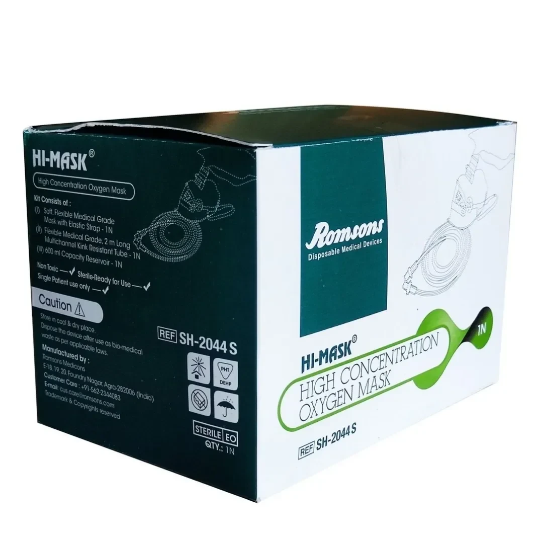 A Hi-Mask for adults, typically referring to a high-concentration oxygen mask or a non-rebreather mask, is a critical medical device used to deliver a high fraction of inspired oxygen (FiO2) to adult patients experiencing significant hypoxemia. This mask system includes a reservoir bag and one-way valves that prevent ambient air and exhaled breath from diluting the oxygen supply, ensuring that the patient receives nearly 100% oxygen. The design is optimized for adult facial contours to provide a secure seal and efficient oxygen delivery.