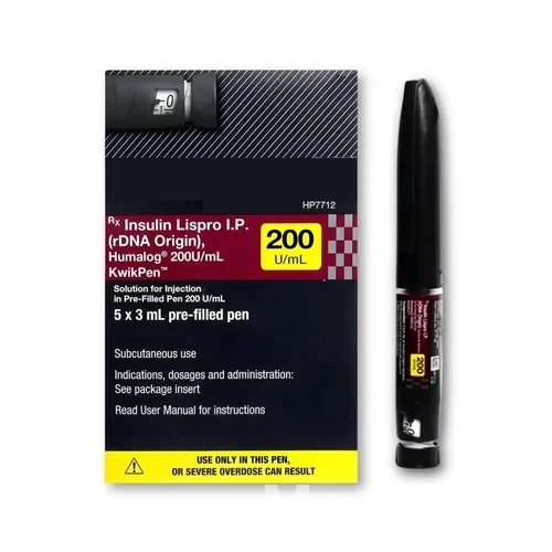 Humalog 200 units/mL KwikPen contains a concentrated formulation of Insulin Lispro, a rapid-acting insulin analogue. This formulation provides 200 units of insulin per milliliter, twice the concentration of standard U-100 insulin. Insulin Lispro acts very quickly, typically within 15-30 minutes, with a peak effect around 1-2 hours and a duration of action of 3-5 hours. The concentrated form is particularly useful for patients requiring higher daily doses of insulin, as it allows for smaller injection volumes, potentially improving comfort and reducing the risk of injection site reactions. It is used to control post-meal blood glucose spikes and can also be used for basal insulin needs in some regimens. Humalog 200U/mL is administered subcutaneously, usually shortly before or after a meal, and requires careful dosing to avoid hypoglycemia due to its potency.