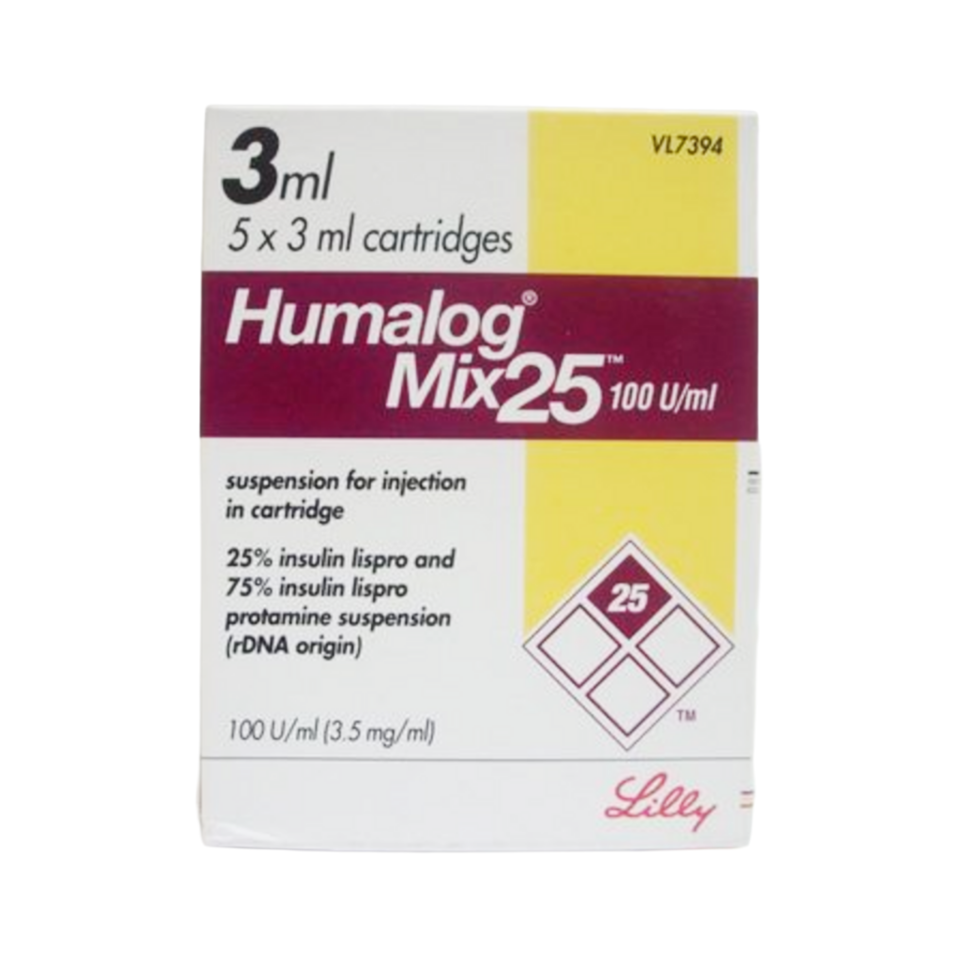 Humalog Mix 25 Cartridge 3ML contains biphasic insulin lispro 25/75, a premixed insulin analogue. This formulation combines 25% rapid-acting insulin lispro and 75% intermediate-acting insulin lispro protamine suspension. It is indicated for the treatment of diabetes mellitus in patients who require both mealtime and basal insulin for glycemic control. The rapid-acting component effectively manages postprandial glucose excursions, while the intermediate-acting component provides a sustained glucose-lowering effect throughout the day. This combination allows for a reduced number of daily injections compared to separate rapid and intermediate-acting insulin regimens, thereby improving patient convenience and adherence. The cartridge format is designed for use with specific insulin pens, facilitating accurate and easy administration. Regular monitoring of blood glucose levels is essential to optimize dosing and achieve target glycemic goals, minimizing the risk of both hyperglycemia and hypoglycemia.