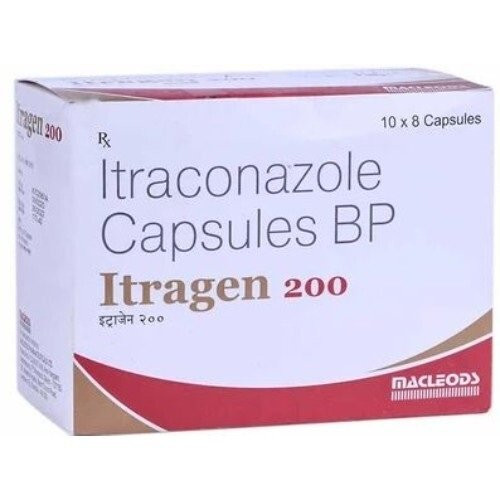 Itragen 200 Tab, containing itraconazole, is a broad-spectrum triazole antifungal agent used to treat various fungal infections. It works by inhibiting the fungal cytochrome P450-dependent enzyme lanosterol 14α-demethylase, which is essential for ergosterol synthesis. Ergosterol is a vital component of the fungal cell membrane, and its depletion leads to increased cell membrane permeability, leakage of cellular contents, and ultimately fungal cell death. This mechanism makes itraconazole effective against a wide range of dermatophytes, yeasts, and molds, including those causing systemic mycoses. Its lipophilic and keratinophilic properties allow it to concentrate in tissues like skin, nails, and vaginal mucosa, providing sustained therapeutic levels.