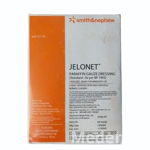 Jelonet is a sterile paraffin gauze dressing, commonly used in wound care to provide a non-adherent layer that protects the wound bed and facilitates healing. It consists of an open-weave gauze impregnated with soft paraffin, which prevents the dressing from sticking to the wound surface, thereby minimizing trauma and pain during dressing changes. The open-weave structure allows exudate to pass through into a secondary absorbent dressing, while the paraffin maintains a moist wound environment conducive to epithelialization and granulation tissue formation. This type of dressing is particularly beneficial for superficial wounds, burns, and skin graft sites where gentle protection and a non-stick interface are crucial.