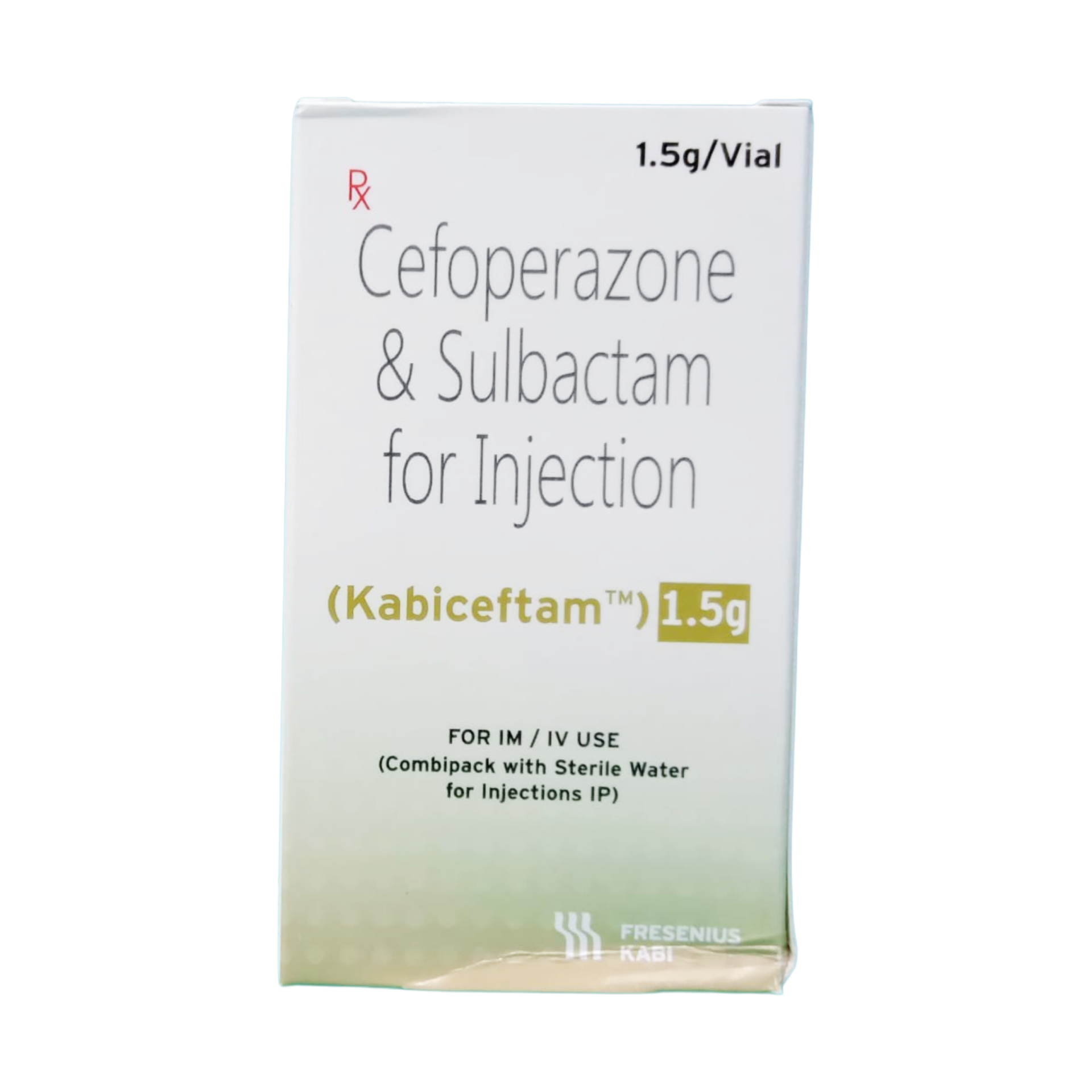 Kabiceftam is a potent injectable antibiotic combining Cefoperazone, a third-generation cephalosporin, with Sulbactam, a beta-lactamase inhibitor. Cefoperazone exerts its bactericidal effect by interfering with bacterial cell wall synthesis, leading to cell lysis and death. However, many bacteria produce beta-lactamase enzymes that can inactivate cefoperazone. Sulbactam acts as a suicide inhibitor of these beta-lactamases, protecting cefoperazone from degradation and significantly broadening its spectrum of activity. This synergistic combination is highly effective against a wide array of Gram-positive and Gram-negative bacteria, including many resistant strains that produce beta-lactamases. It is particularly valuable for treating severe and complicated infections in various body systems, such as intra-abdominal, respiratory, urinary tract, and skin and soft tissue infections, where broad-spectrum coverage and resistance overcoming capabilities are crucial.