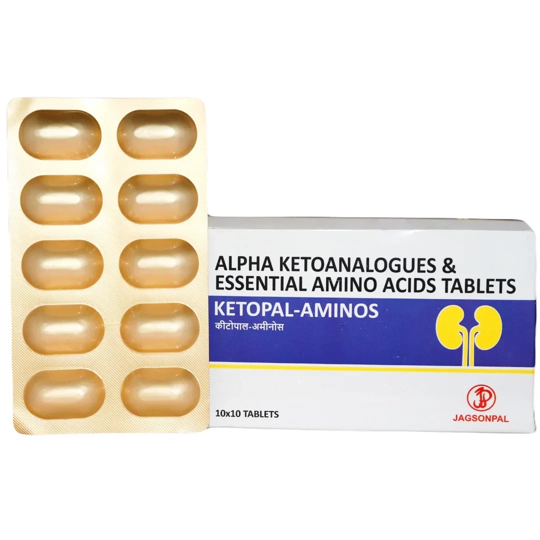 KETOPAL AMINOS TAB is a highly specialized nutritional therapeutic agent specifically formulated for the management of chronic kidney disease (CKD), particularly in patients adhering to a very low-protein diet. This medication comprises keto-analogues of essential amino acids, which are unique compounds that lack the nitrogenous amino group. Upon ingestion, these keto-analogues are metabolically converted into their corresponding essential amino acids by utilizing nitrogen derived from non-essential amino acids and urea within the body. This ingenious process effectively recycles nitrogenous waste, thereby significantly reducing the overall nitrogen load that the compromised kidneys must excret.