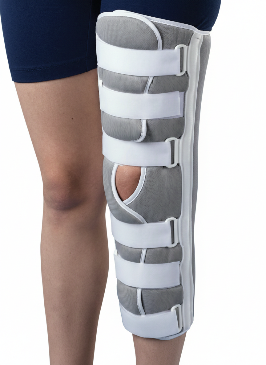 A long knee immobilizer is a medical device designed to provide rigid support and restrict movement of the knee joint following injury or surgery. Constructed typically from a combination of rigid posterior and lateral stays, padded liners, and adjustable hook-and-loop straps, it extends from the thigh to the calf, ensuring comprehensive stabilization. Its primary function is to prevent flexion and extension, thereby protecting healing tissues, reducing pain, and minimizing the risk of further damage. This immobilization is crucial in the initial stages of recovery for various knee pathologies, including severe sprains, fractures, dislocations, and post-operative conditions such as ligament repairs or meniscectomies. The design aims to maintain the knee in an extended position, facilitating proper alignment and promoting an optimal healing environment.