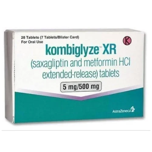 KOMBIGLYZE XR 5/500mg is an extended-release oral medication combining saxagliptin and metformin, indicated for the treatment of type 2 diabetes mellitus. Saxagliptin is a dipeptidyl peptidase-4 (DPP-4) inhibitor that enhances the body's natural ability to control blood glucose by increasing the levels of active incretin hormones, which stimulate insulin release and suppress glucagon secretion in a glucose-dependent manner. Metformin, a biguanide, primarily reduces hepatic glucose production, decreases intestinal absorption of glucose, and improves insulin sensitivity by increasing peripheral glucose uptake and utilization.