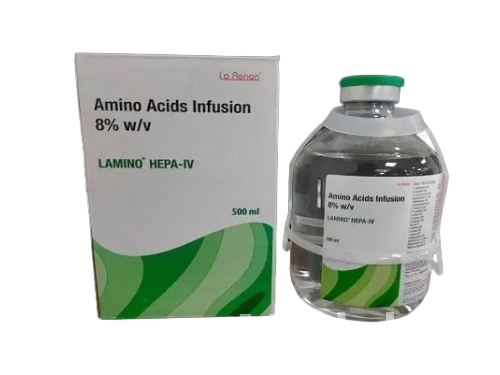 LAMINO HEPA IV is a specialized intravenous amino acid solution specifically formulated for patients with severe liver impairment, including those with hepatic encephalopathy. Unlike standard amino acid solutions, LAMINO HEPA features a modified amino acid profile, characterized by a high concentration of branched-chain amino acids (BCAAs) and a reduced amount of aromatic amino acids. This unique composition is crucial because in liver failure, the liver's ability to metabolize aromatic amino acids is compromised, leading to their accumulation and contributing to hepatic encephalopathy. By providing a balanced supply of BCAAs, which are metabolized in muscle rather than the liver, this solution supports protein synthesis, helps to prevent muscle catabolism, and can improve nitrogen balance without exacerbating liver-related neurological complications. It is a critical component of nutritional support for patients with advanced liver disease, aiding in recovery and maintaining vital bodily functions.