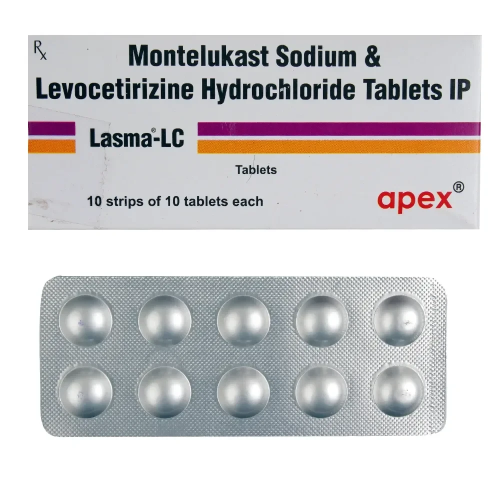 Lasma LC Tab is a combination medication primarily indicated for the comprehensive management of allergic conditions and asthma. It typically comprises Levocetirizine, a potent second-generation antihistamine, and Montelukast, a leukotriene receptor antagonist. Levocetirizine works by selectively blocking histamine H1 receptors, thereby inhibiting the action of histamine, a key mediator in allergic reactions, which reduces symptoms like sneezing, rhinorrhea, and pruritus. Montelukast, on the other hand, selectively antagonizes the cysteinyl leukotriene type 1 (CysLT1) receptor, preventing the inflammatory effects of leukotrienes in the airways, leading to reduced bronchoconstriction and inflammation. This dual mechanism of action provides effective relief from both allergic rhinitis and asthma symptoms, offering a synergistic approach to respiratory and allergic health.