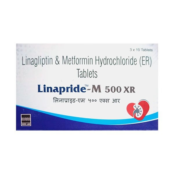 LINAPRIDE M XR 500 is a combination medication for the treatment of type 2 diabetes mellitus, typically containing Linagliptin and Metformin Extended-Release 500mg. Linagliptin is a dipeptidyl peptidase-4 (DPP-4) inhibitor that works by increasing the levels of active incretin hormones (GLP-1 and GIP). These hormones enhance glucose-dependent insulin secretion from pancreatic beta cells and suppress glucagon release from alpha cells, leading to improved blood glucose control. Metformin, in its extended-release form, reduces hepatic glucose production and improves insulin sensitivity over a prolonged period. This synergistic action helps to lower both fasting and post-meal blood sugar levels, providing comprehensive and sustained glycemic management for adults with type 2 diabetes, especially when diet and exercise alone are insufficient.