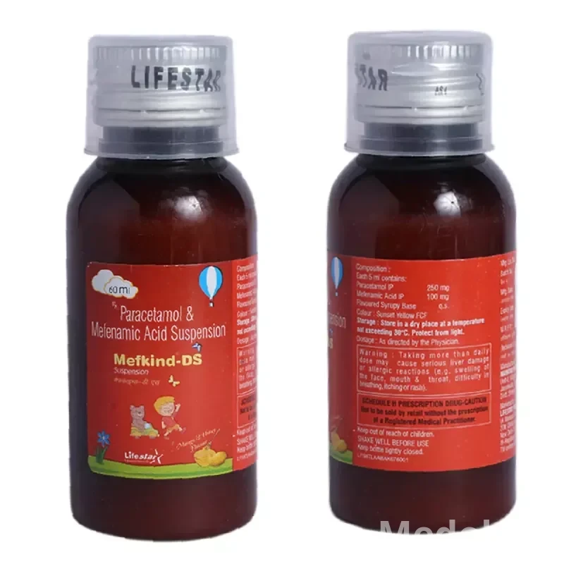 Mefkind DS Syrup 60ml is a double-strength oral suspension containing Mefenamic Acid, a non-steroidal anti-inflammatory drug (NSAID). It functions by inhibiting the synthesis of prostaglandins, which are chemical mediators responsible for pain, inflammation, and fever in the body. By blocking the cyclooxygenase (COX-1 and COX-2) enzymes, Mefenamic Acid effectively reduces these symptoms. This formulation is particularly suited for pediatric use due to its liquid form and double strength, allowing for effective dosing in children for various painful and febrile conditions.