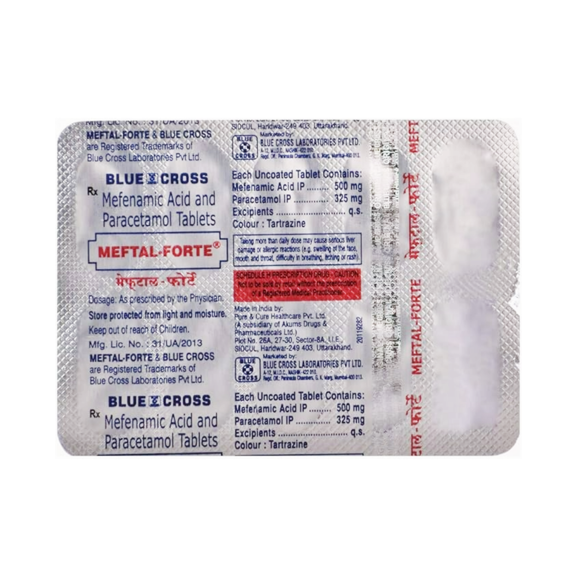 MEFTAL FORTE TAB contains Mefenamic Acid, a non-steroidal anti-inflammatory drug (NSAID) known for its analgesic, anti-inflammatory, and antipyretic properties. It works by inhibiting the synthesis of prostaglandins, which are chemical mediators involved in the body's inflammatory response, pain perception, and fever generation. By reducing prostaglandin production, Mefenamic Acid effectively alleviates pain, reduces swelling, and lowers fever associated with various conditions.