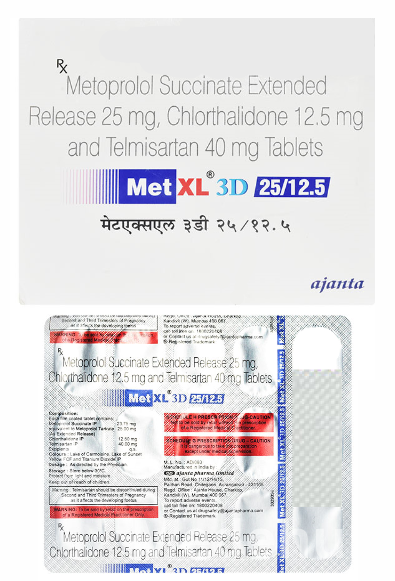 MET XL 3D 25/12.5 is a triple-combination medication designed for the effective management of severe or resistant essential hypertension. It integrates metoprolol succinate extended-release, a cardioselective beta-1 adrenergic blocker; hydrochlorothiazide, a thiazide diuretic; and an angiotensin II receptor blocker (ARB). This comprehensive formulation targets distinct yet complementary pathways involved in blood pressure regulation. Metoprolol reduces heart rate and myocardial contractility, hydrochlorothiazide promotes the excretion of sodium and water, thereby reducing blood volume, and the ARB blocks the vasoconstrictive and aldosterone-secreting effects of angiotensin II. The synergistic action of these three agents provides potent and sustained blood pressure control, significantly reducing the risk of major cardiovascular events such as stroke and myocardial infarction. This combination is particularly valuable for patients who require multiple antihypertensive agents to achieve their target blood pressure goals, offering a simplified regimen and enhanced therapeutic outcomes.