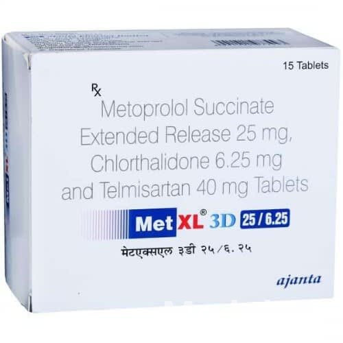 MET XL 3D 25/6.25 is a triple-combination medication designed for the effective management of severe or resistant essential hypertension. It integrates metoprolol succinate extended-release, a cardioselective beta-1 adrenergic blocker; hydrochlorothiazide, a thiazide diuretic; and an angiotensin II receptor blocker (ARB). This comprehensive formulation targets distinct yet complementary pathways involved in blood pressure regulation. Metoprolol reduces heart rate and myocardial contractility, hydrochlorothiazide promotes the excretion of sodium and water, thereby reducing blood volume, and the ARB blocks the vasoconstrictive and aldosterone-secreting effects of angiotensin II. The synergistic action of these three agents provides potent and sustained blood pressure control, significantly reducing the risk of major cardiovascular events such as stroke and myocardial infarction. This combination is particularly valuable for patients who require multiple antihypertensive agents to achieve their target blood pressure goals, offering a simplified regimen and enhanced therapeutic outcomes.