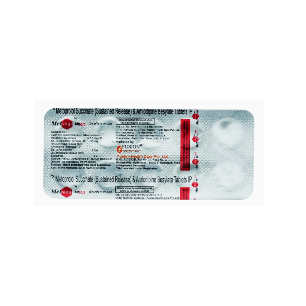Metstop AM 50/5 combines two potent cardiovascular medications: metoprolol, a beta-blocker, and amlodipine, a dihydropyridine calcium channel blocker. Metoprolol works by selectively blocking beta-1 adrenergic receptors, reducing heart rate, myocardial contractility, and blood pressure. Amlodipine, on the other hand, relaxes vascular smooth muscle, leading to vasodilation and a decrease in peripheral vascular resistance, which also lowers blood pressure. This synergistic combination provides comprehensive control over hypertension and angina by addressing different physiological pathways. It is particularly useful for patients who require more aggressive blood pressure management or those who experience angina pectoris, offering improved efficacy compared to monotherapy. The dual mechanism helps to achieve target blood pressure more effectively while potentially minimizing the dose-dependent side effects of each component when used alone, thereby enhancing patient adherence and overall cardiovascular outcomes.
