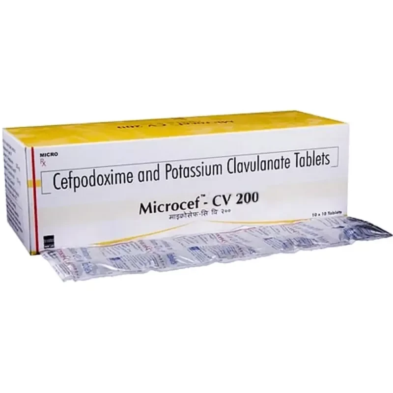 MICROCEF CV 200 TAB is a combination antibiotic containing Cefixime and Clavulanic Acid. Cefixime, a third-generation cephalosporin, works by inhibiting bacterial cell wall synthesis, leading to bactericidal action. Clavulanic Acid is a beta-lactamase inhibitor that protects cefixime from enzymatic degradation by resistant bacteria, thereby broadening its spectrum of activity. This synergistic combination is highly effective against a wide range of bacterial infections, including those caused by beta-lactamase-producing strains, which are often resistant to other antibiotics. It is commonly prescribed for respiratory tract infections, urinary tract infections, and skin and soft tissue infections, offering a potent solution against various common pathogens.