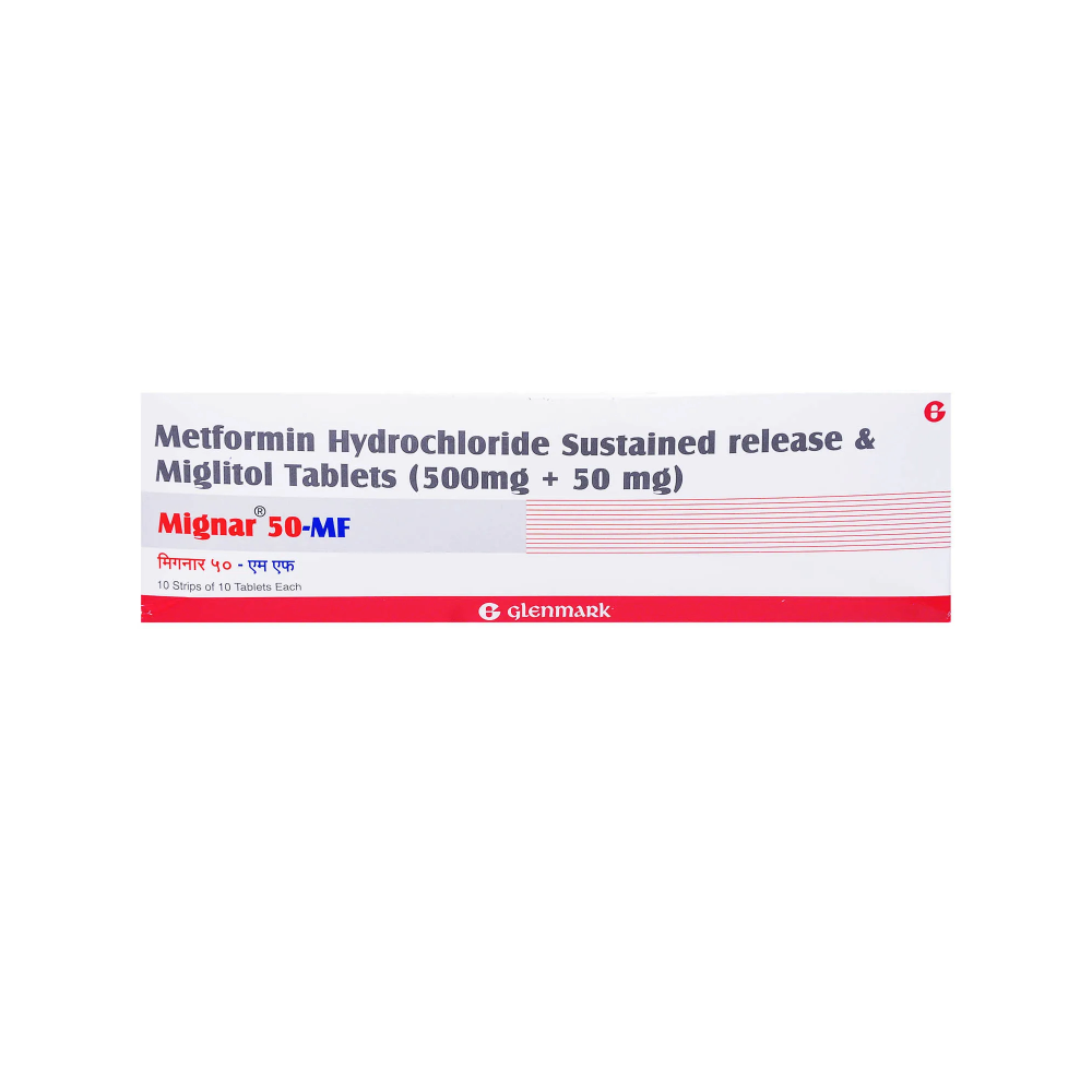MIGNAR 50 MF is a fixed-dose combination medication containing Vildagliptin and Metformin, prescribed for the management of Type 2 Diabetes Mellitus. Vildagliptin is a dipeptidyl peptidase-4 (DPP-4) inhibitor that works by increasing the levels of incretin hormones, GLP-1 and GIP, which in turn enhance insulin secretion from pancreatic beta cells and suppress glucagon secretion from alpha cells, particularly in a glucose-dependent manner. This mechanism helps to reduce post-meal and fasting blood glucose levels without a high risk of hypoglycemia.