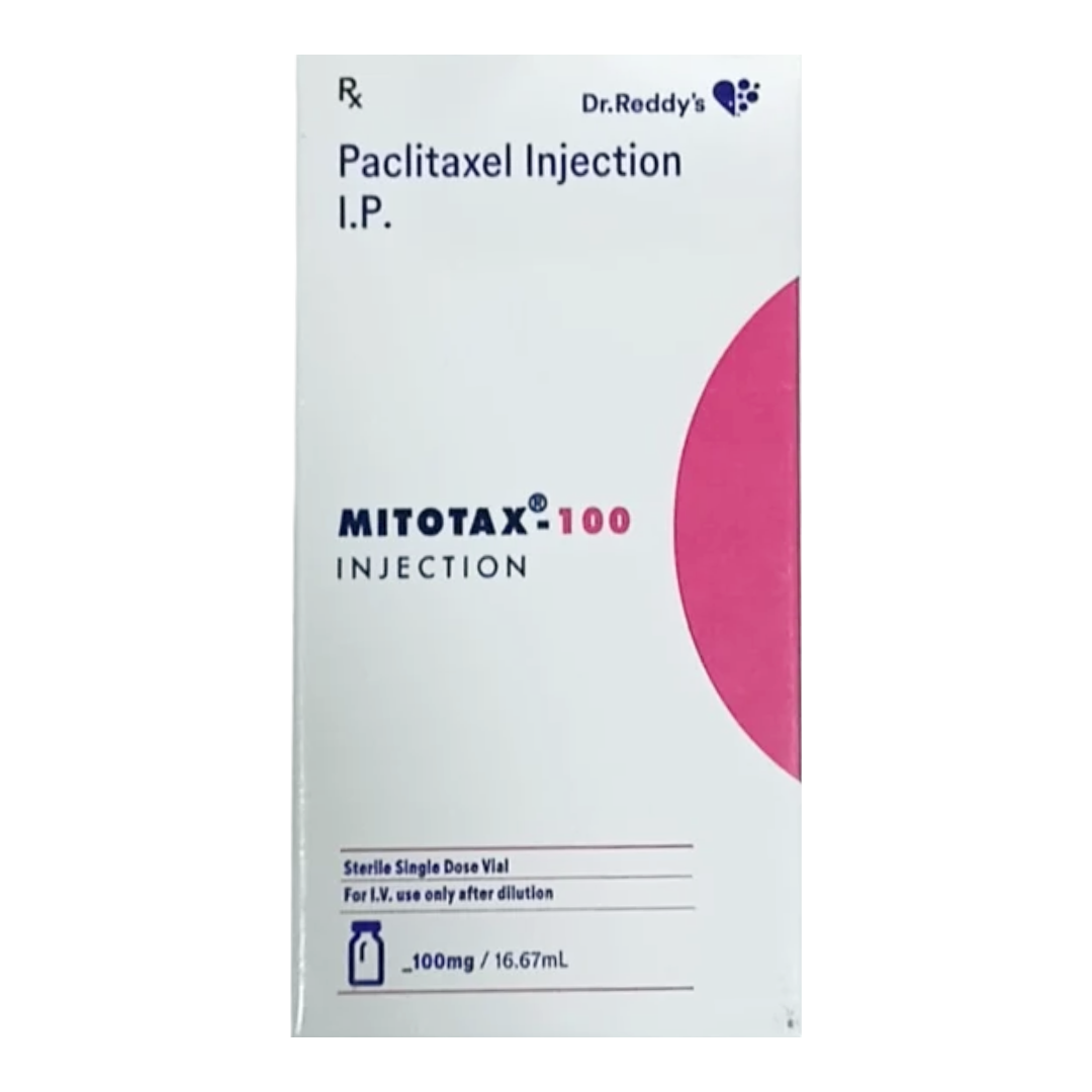 Mitotax 100mg Injection contains Paclitaxel, a highly effective antineoplastic agent classified within the taxane family. Its primary mechanism of action involves disrupting the normal dynamics of microtubule formation and breakdown, which are essential for cell division. Paclitaxel promotes the assembly of microtubules from tubulin dimers and, crucially, stabilizes them, preventing their depolymerization. This stabilization leads to the accumulation of non-functional microtubules within the cell, effectively arresting the cell cycle in the M-phase and ultimately inducing apoptosis in rapidly proliferating cancer cells. This cytotoxic effect makes Mitotax a cornerstone in the treatment of various solid tumors. It is widely indicated for advanced ovarian cancer, metastatic breast cancer, non-small cell lung cancer (NSCLC), and AIDS-related Kaposi's sarcoma, often administered as part of a combination chemotherapy regimen to maximize therapeutic efficacy and improve patient outcomes.