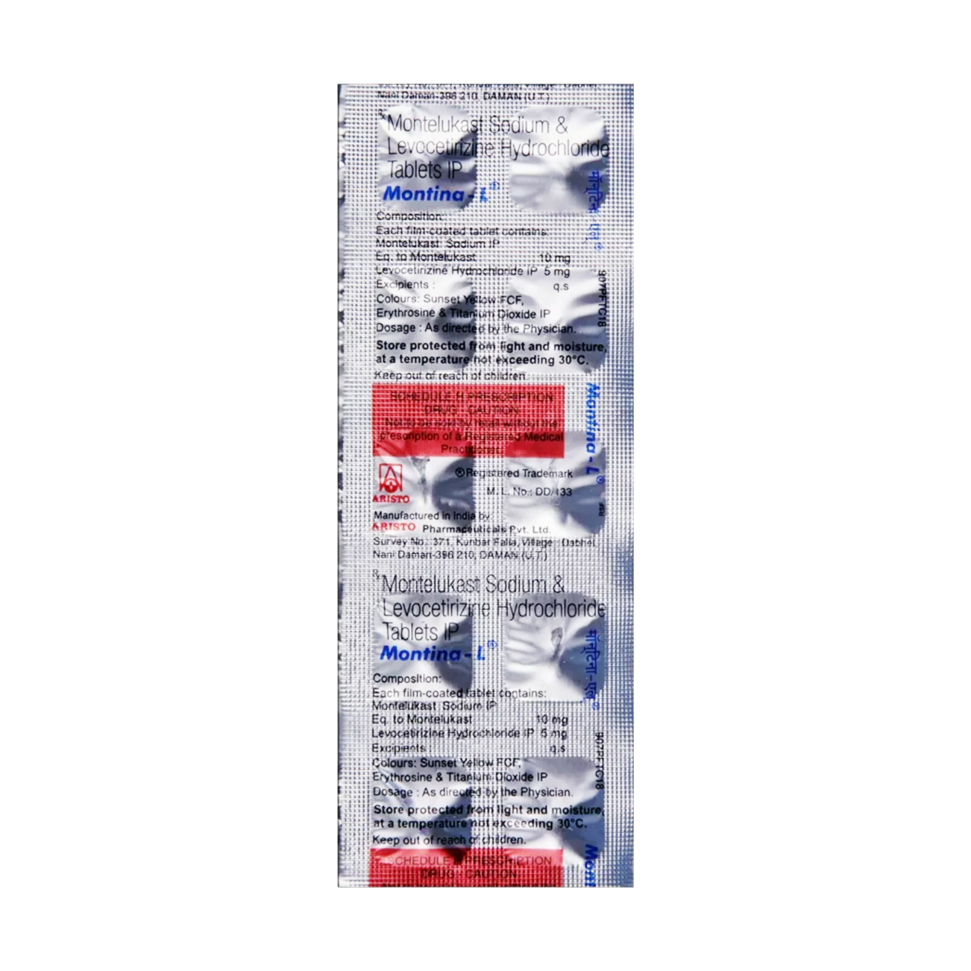 MONTINA L TAB is a combination medication formulated to provide comprehensive relief from allergic conditions and asthma. It typically contains Montelukast, a leukotriene receptor antagonist, and Levocetirizine, a non-sedating antihistamine. Montelukast works by blocking the action of leukotrienes, which are chemicals released in the body that cause inflammation, bronchoconstriction, and mucus production, thereby reducing asthma symptoms and allergic rhinitis. Levocetirizine, on the other hand, selectively blocks histamine H1 receptors, effectively alleviating symptoms such as sneezing, runny nose, itchy eyes, and skin rashes associated with allergies. This dual-action approach targets both the inflammatory and symptomatic aspects of allergic and respiratory conditions, offering sustained relief and improving quality of life for patients.